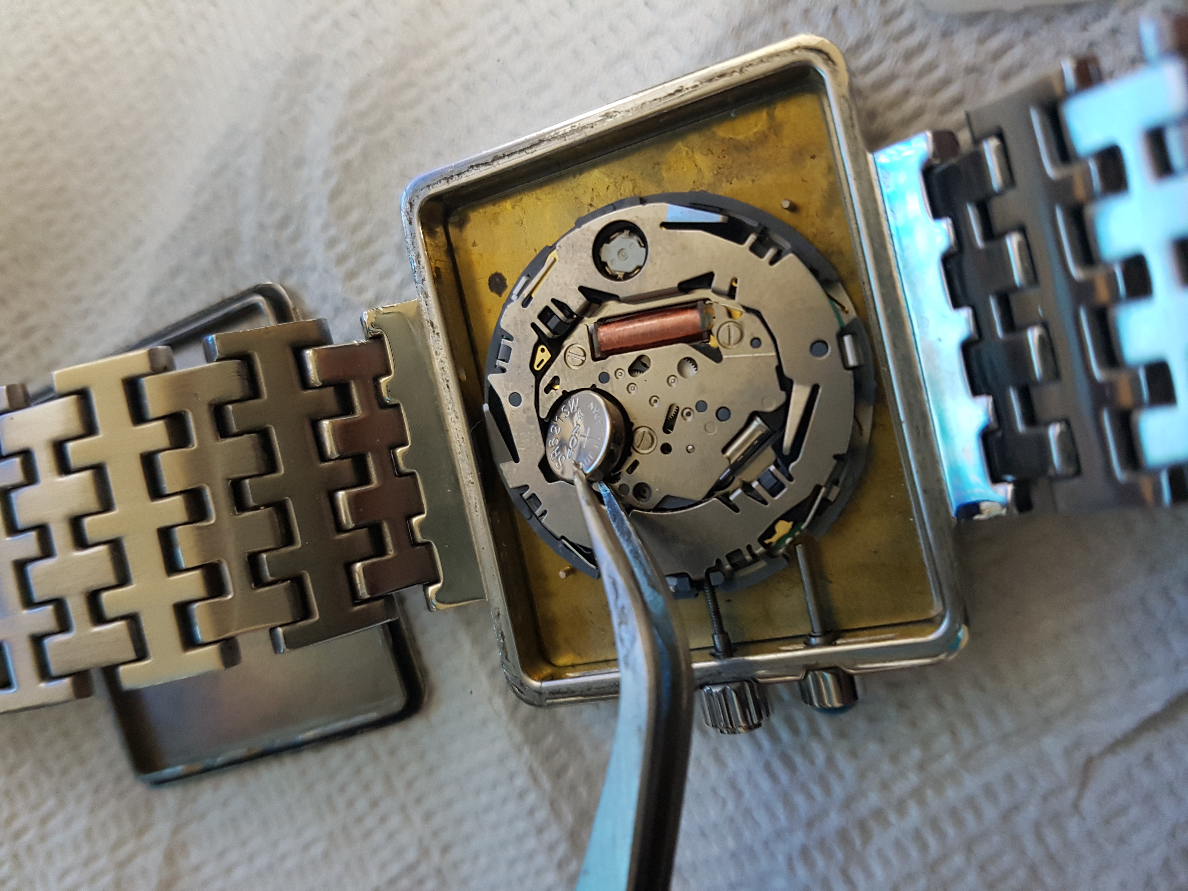 핀셋으로 기존 건전지를 제거하고 새로 산 건전지로 교체한다.