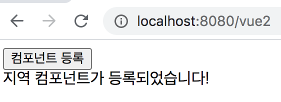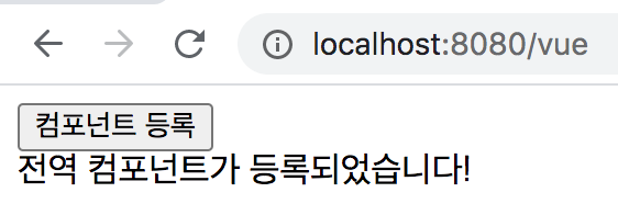 <html> <head> <title>Vue Component Registration</title> </head> <body> <div id="app"> <button>컴포넌트 등록</button> <my-component></my-component> </div> <script src="https://cdn.jsdelivr.net/npm/vue@2.5.2/dist/vue.js"></script> <script> Vue.component('my-component', { template: '<div>전역 컴포넌트가 등록되었습니다!</div>' }); new Vue({ el: '#app' }); </script> </body> </html>