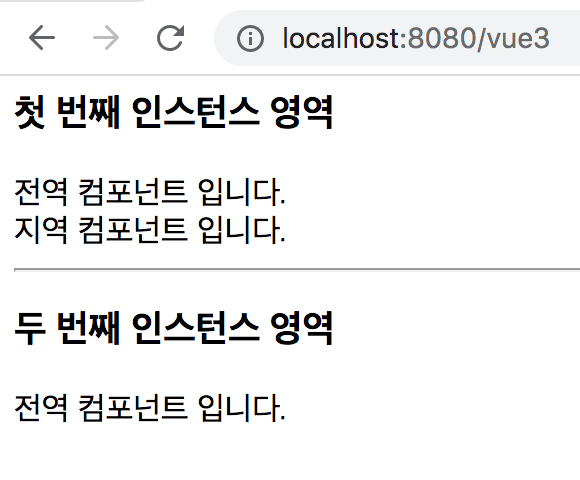 이번에는 인스턴스를 2개를 생성했다. app, app2 두 인스턴스 모두 my-global-component, my-local-component를 인스턴스 유효 범위에서 사용하려 하고 있다. 하지만 app에서는 components에서 cmp를 등록하였고 app2에서는 등록하지 않았다. 모두 예상하는 대로 결과는 아래와 같다.