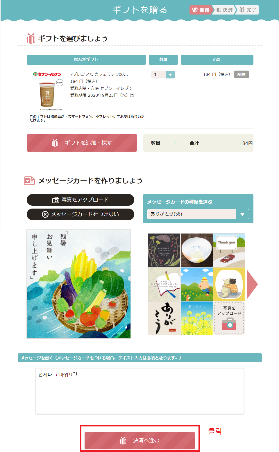 4. 선물카드랑 메세지를 입력하고 선물 상자를 누른다.