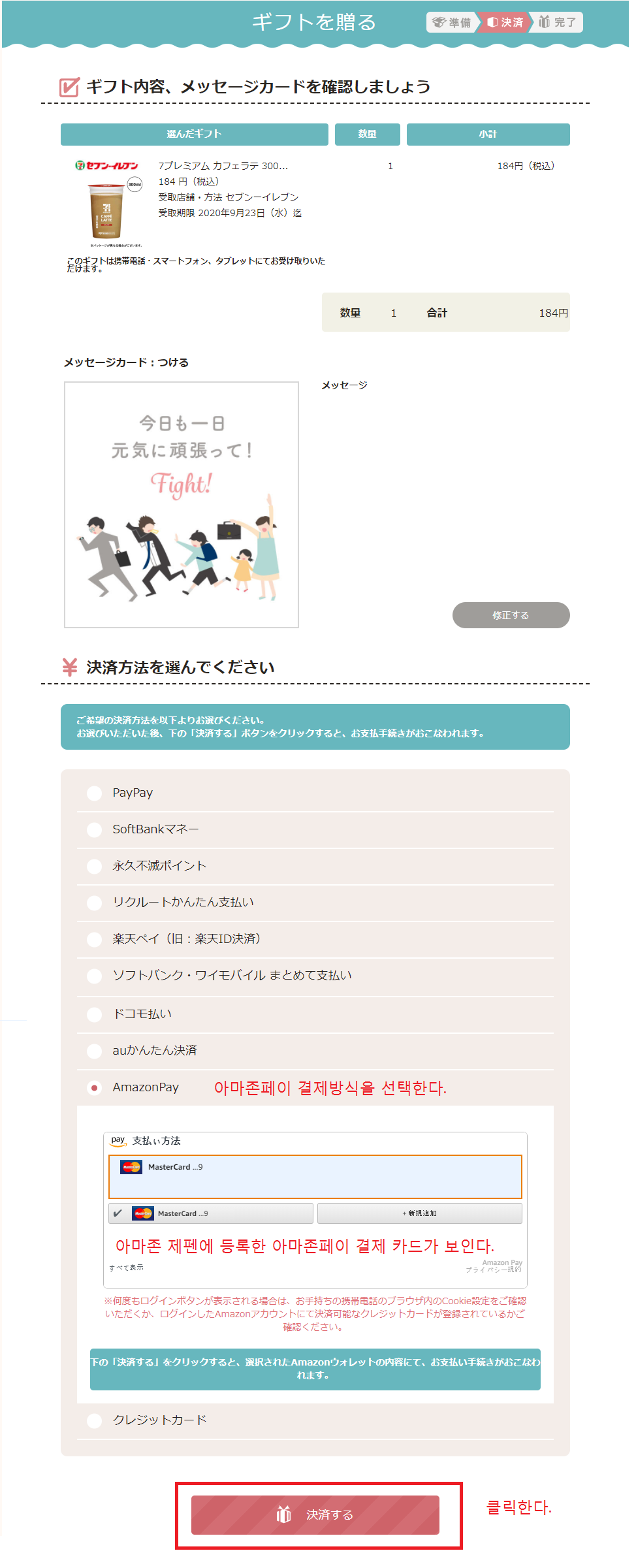 5. 아마존페이 결제 방식을 선택하고 선물상자를 누른다.