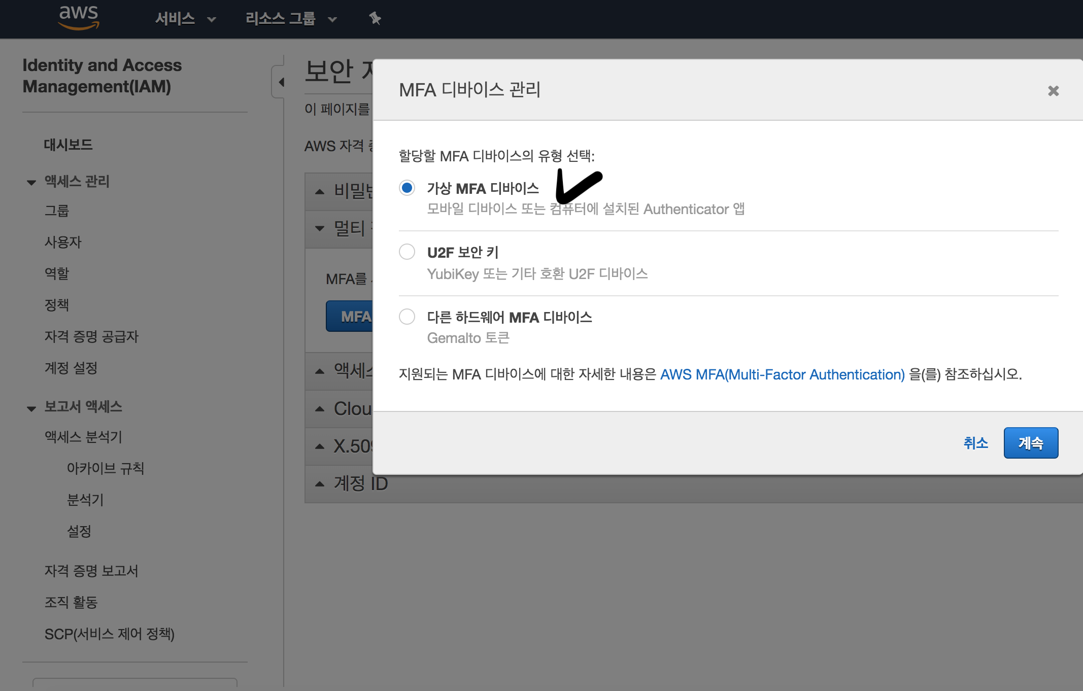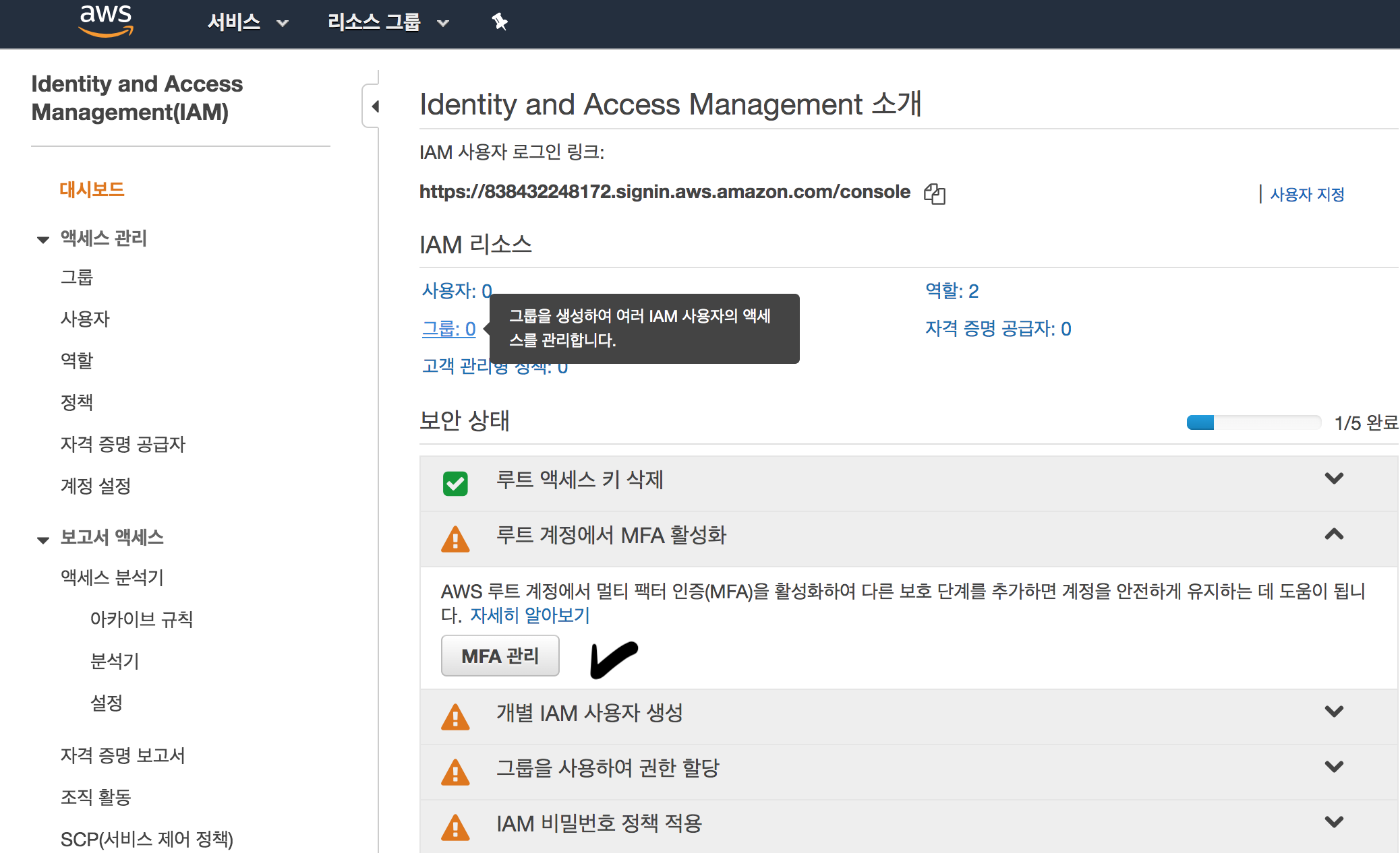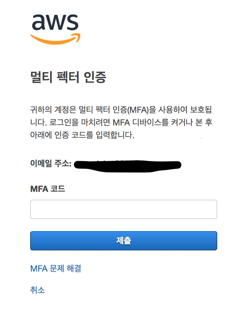 13. 이제 AWS 로그인할때(콘솔 로그인이라고도 함) 비밀번호 입력 후 구글 OTP숫자를 추가로 인증해야 로그인이 완료 된다.