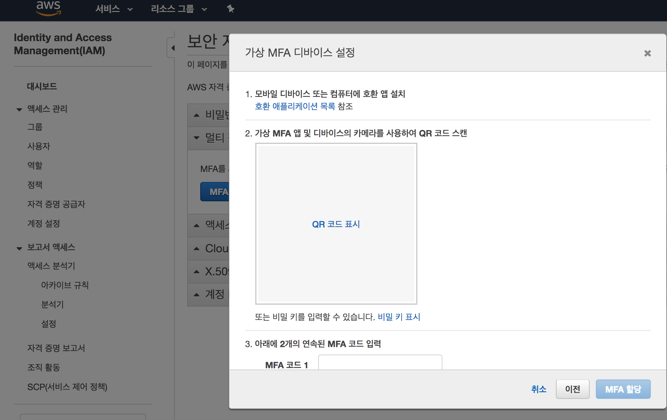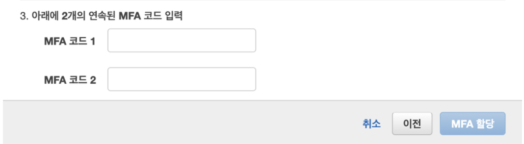 12. QR 코드 표시를 누르고 Google Authenticator에서 스캔하면 앱 OTP 목록에 추가될거고 일정 시간마다 코드가 갱신되고 연속된 코드를 입력하고 MFA 할당하면 된다.