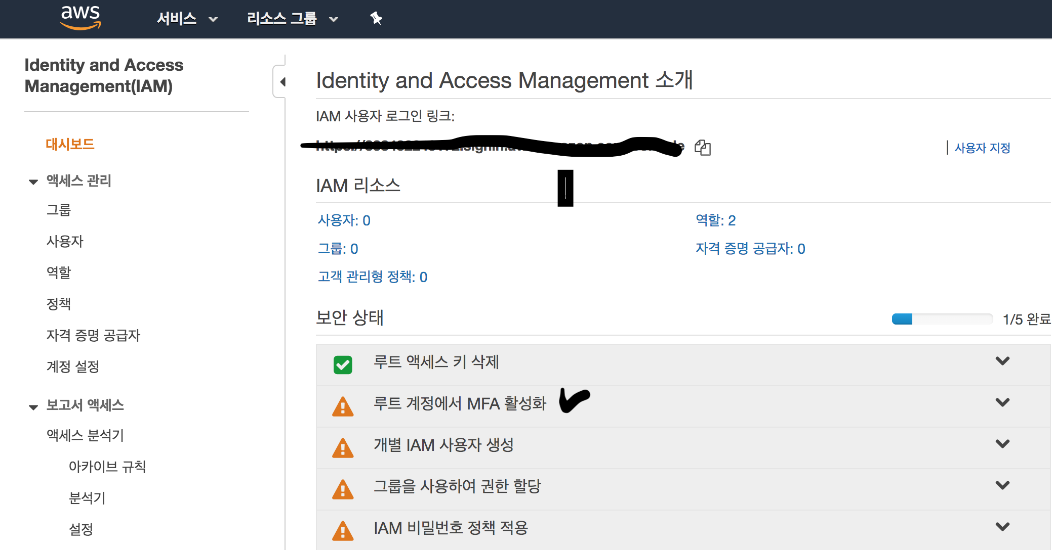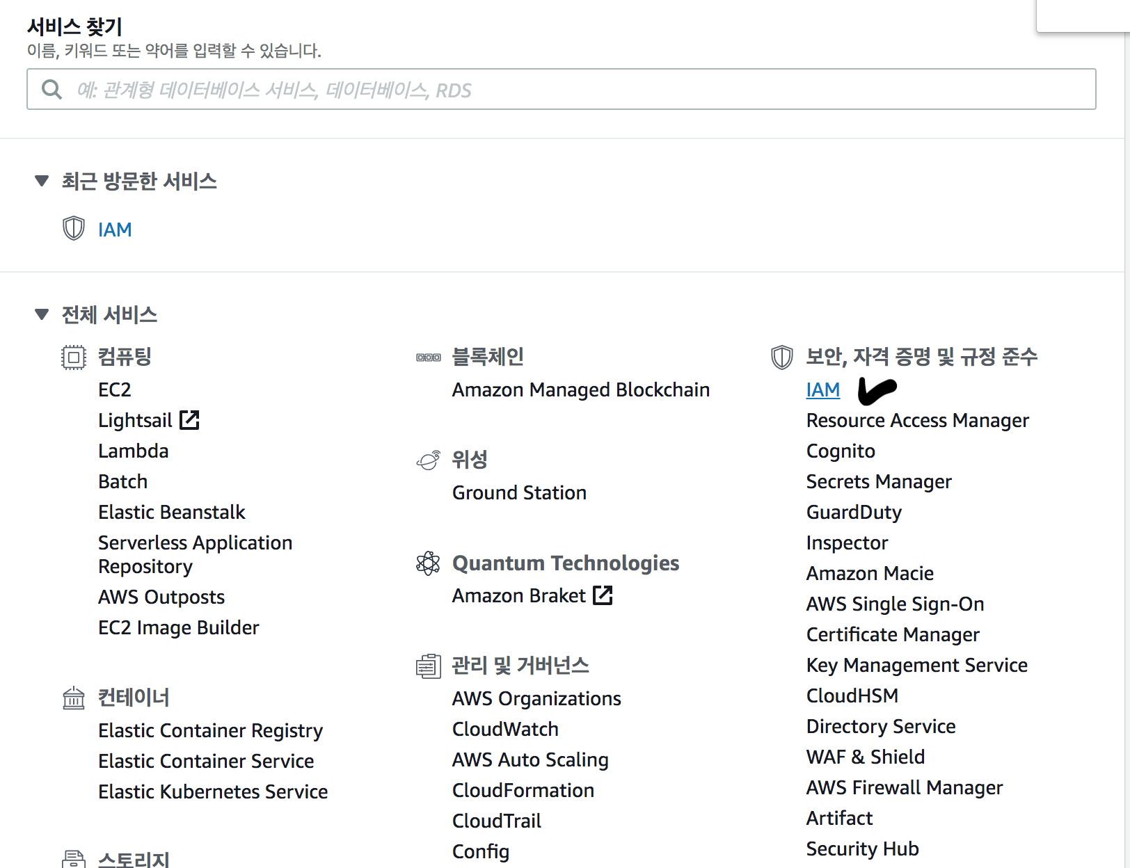 6. 필요에 따라 구글 OTP로 2단계인증을 설정 할 수 있다. 전체 서비스에서 IAM 클릭