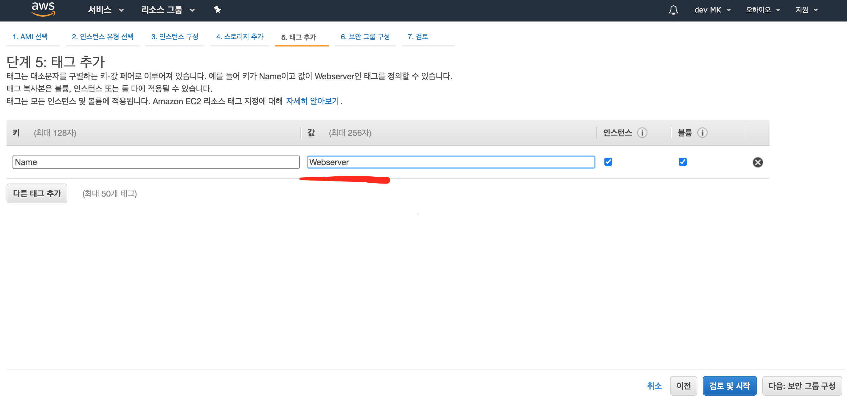 9. 서버의 이름을 지정하는데 키는 Name 값은 Webserver로 지정했다.