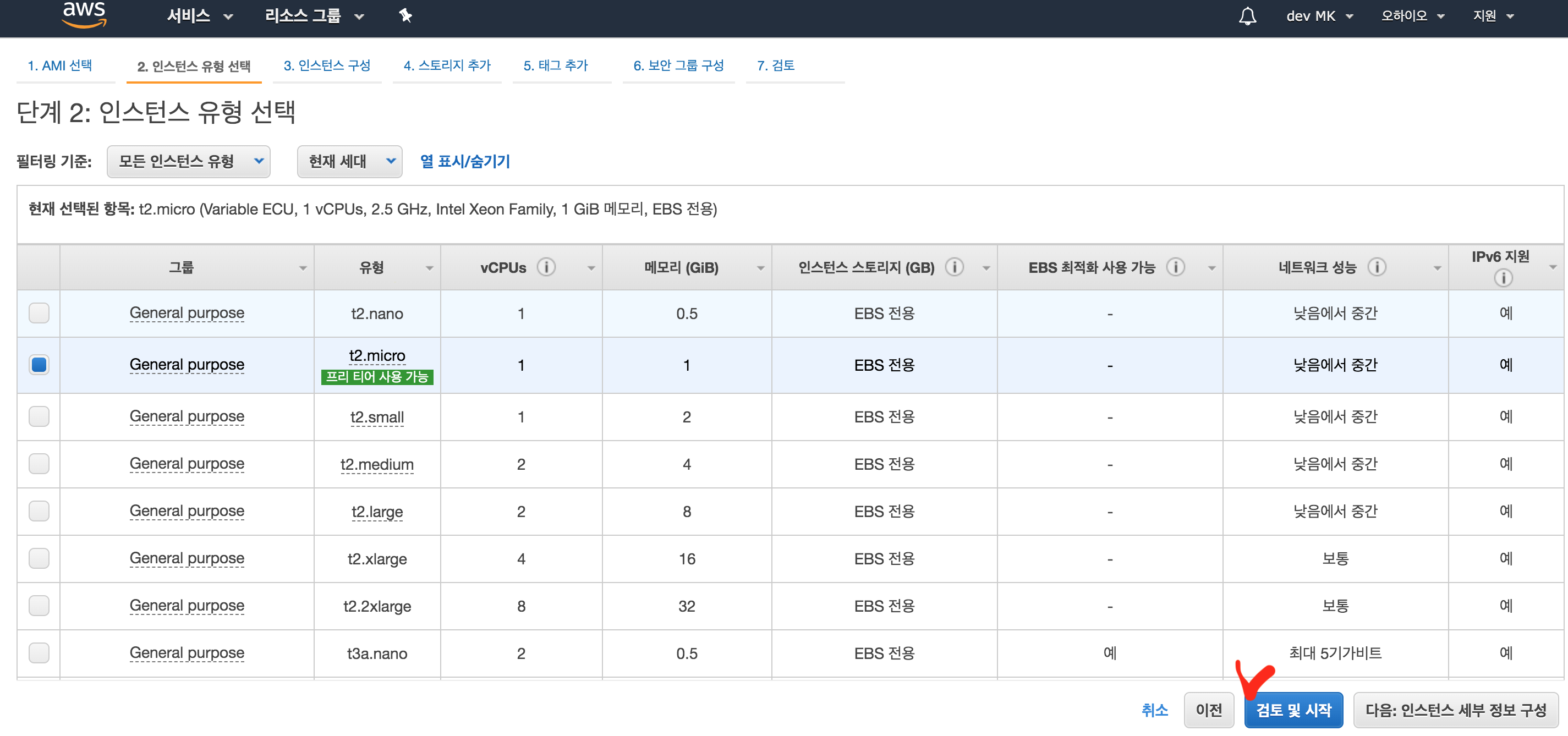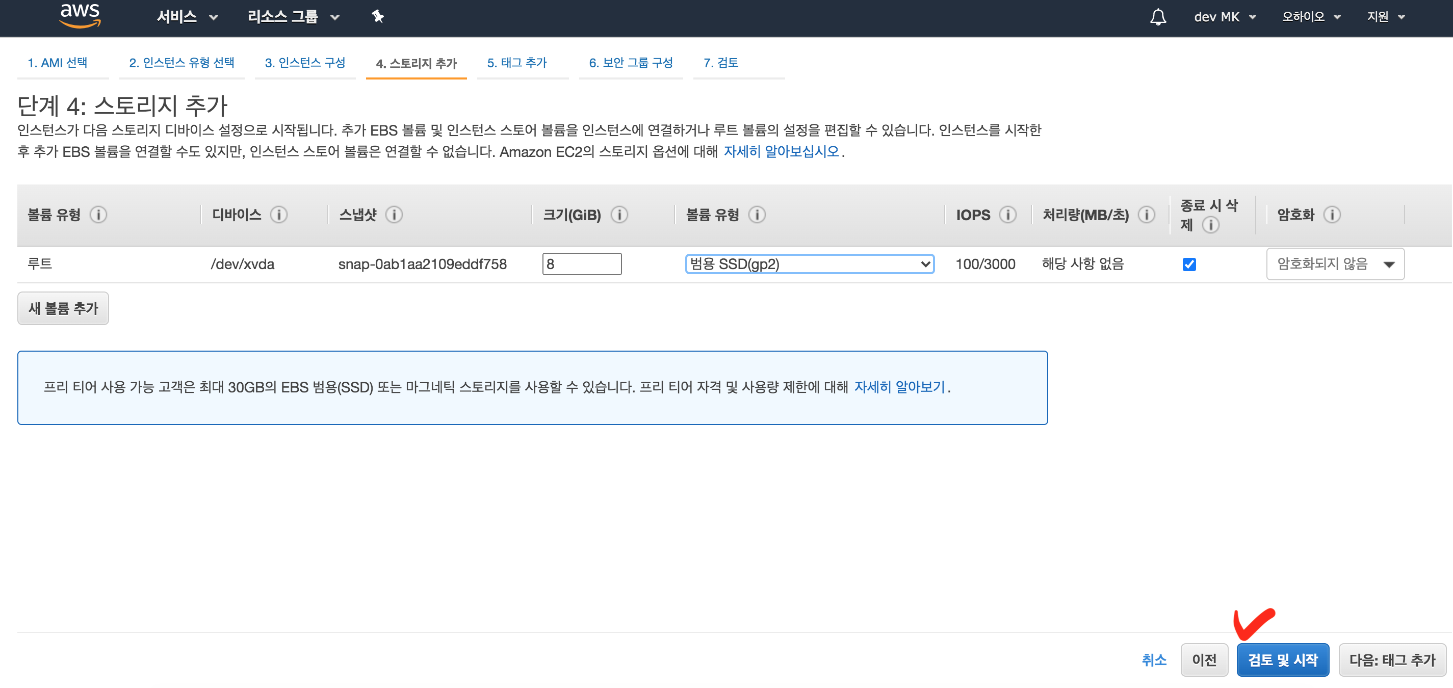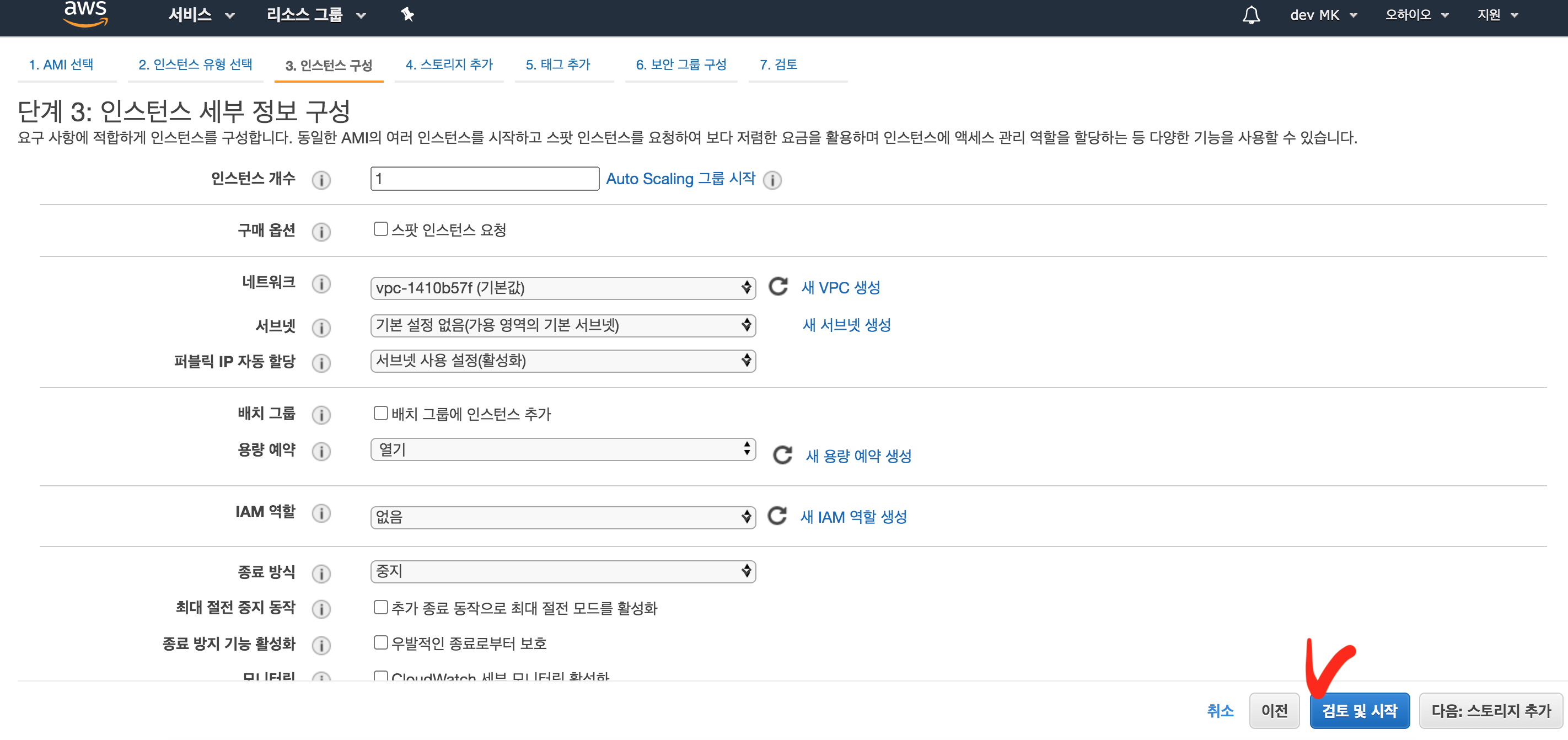 8. 그냥 디폴트 값 확인하고 [검토 및 시작] 누른다.