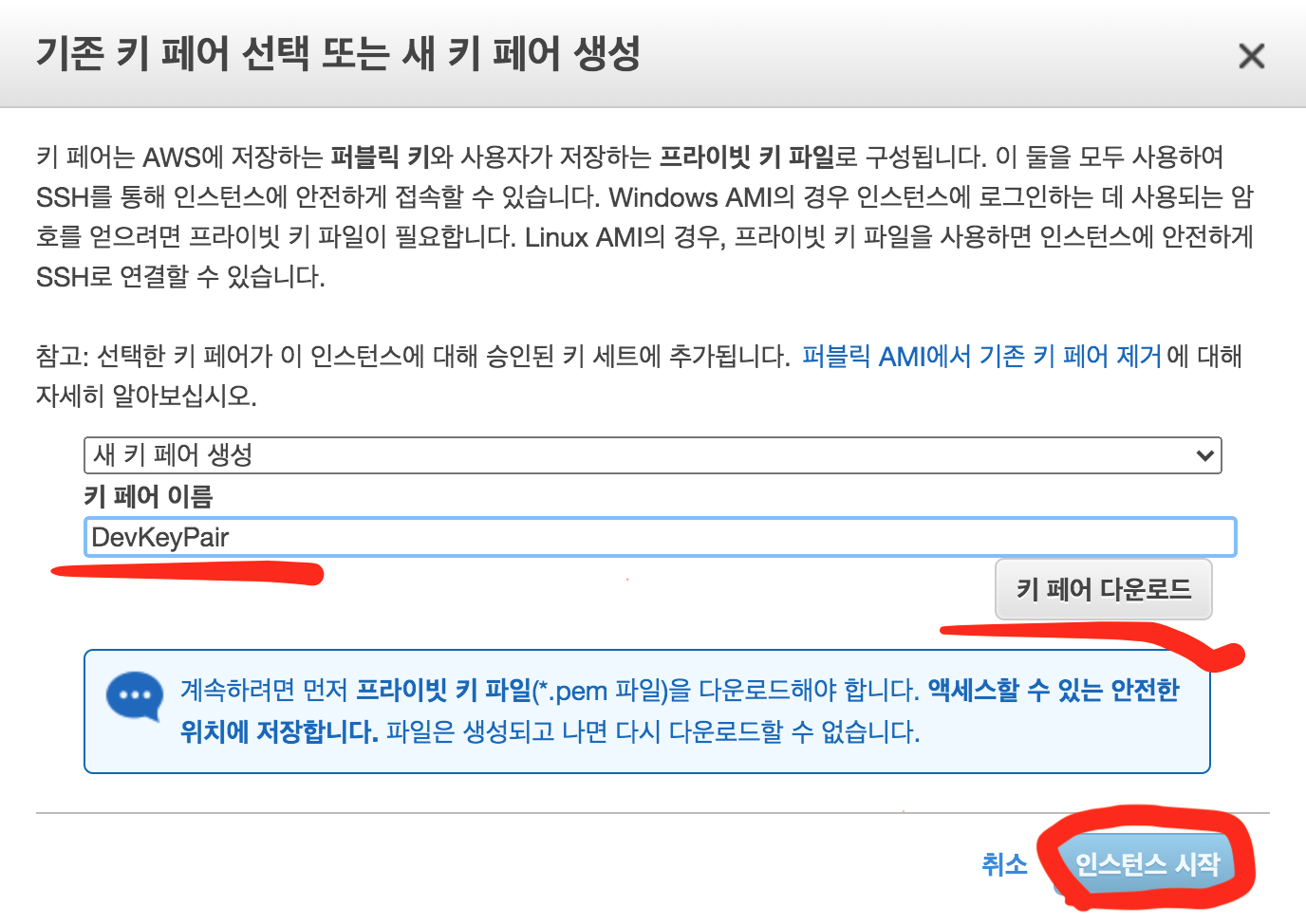 키페어를 다운로드하면 .pem파일이 생성되는데 SSH 터미널로 인스턴스에 접근할 때 꼭 필요한 파일이다. 외부에 노출되어서도 안되며, 잃어버려서도 안되기 때문에 잘 보관하고 있어야 한다. 공인인증서 파일 같다고 생각하면 된다.