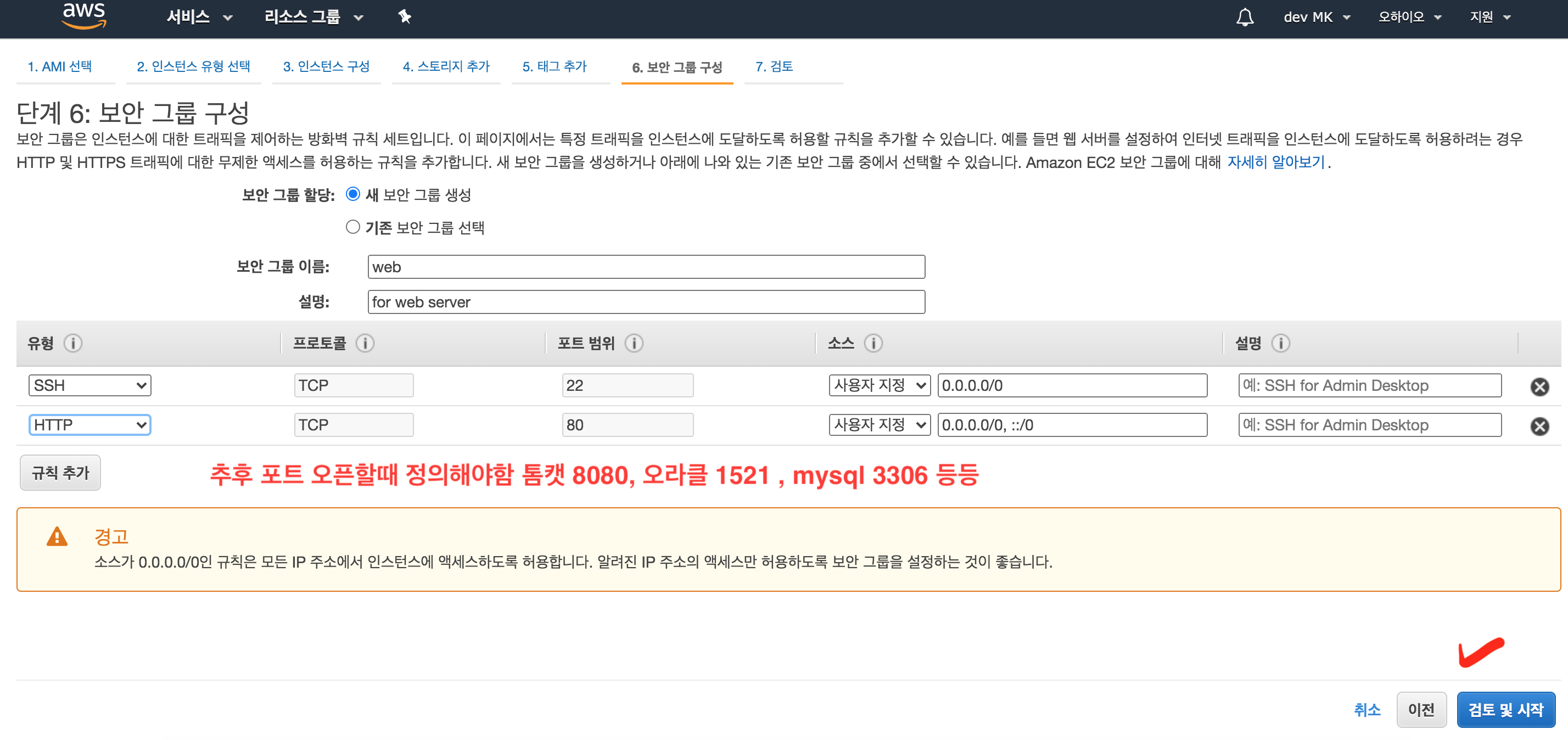 10. 추후에 포트 오픈을 설정하는 곳인데 지금은 설치한게 없으니깐 일단 [검토 및 시작]만 눌러서 다음으로 넘어 간다.