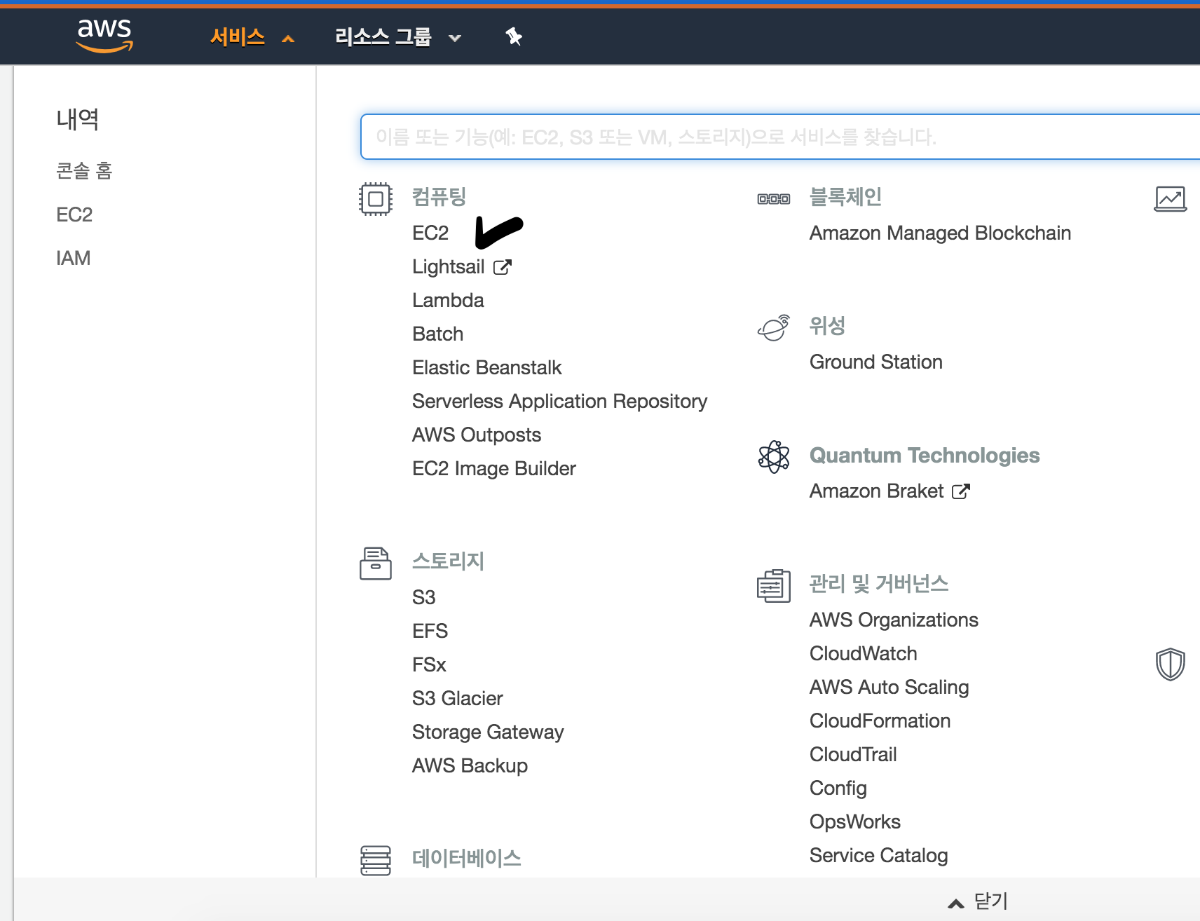 1. 서비스에서 EC2 클릭 한다. 흔히 말하는 아마존웹서비스를 EC2라고 일컫는다.