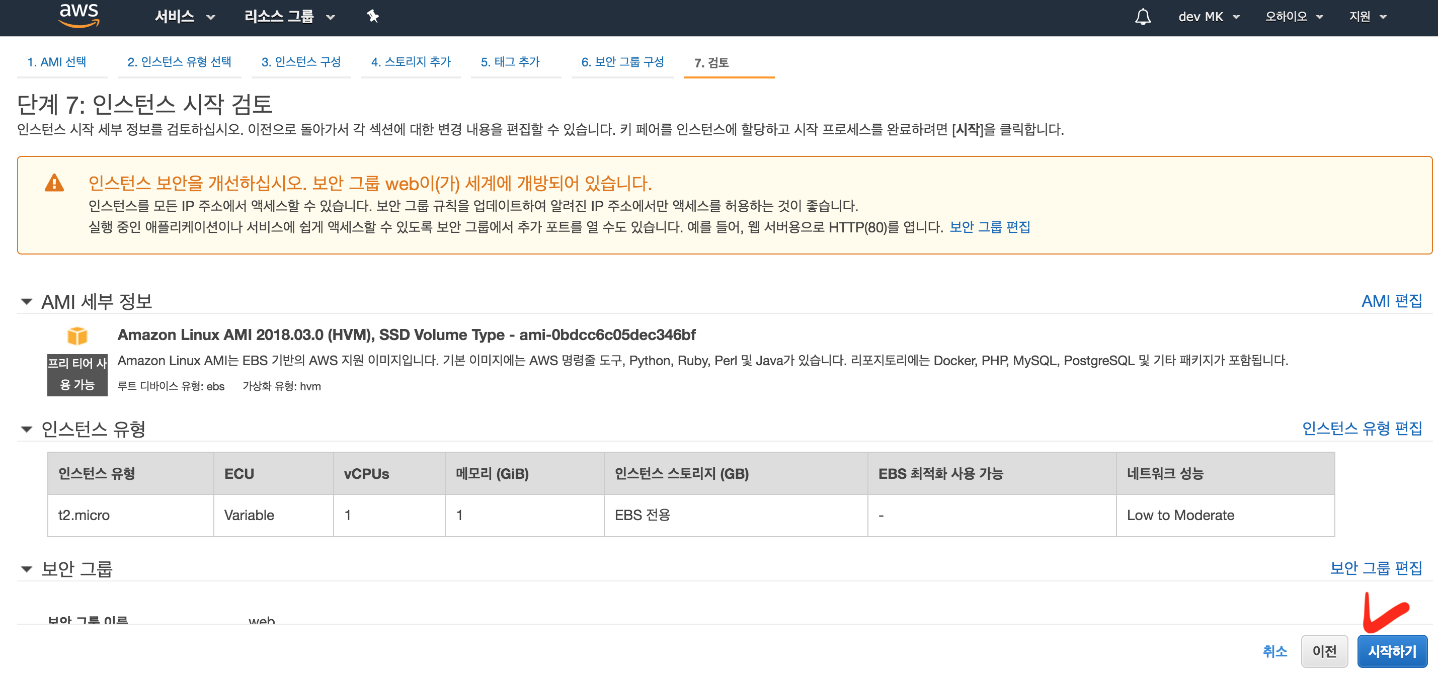 4. 인스턴스 시작을 누른다. 서버를 생성한다고 생각하면 된다.