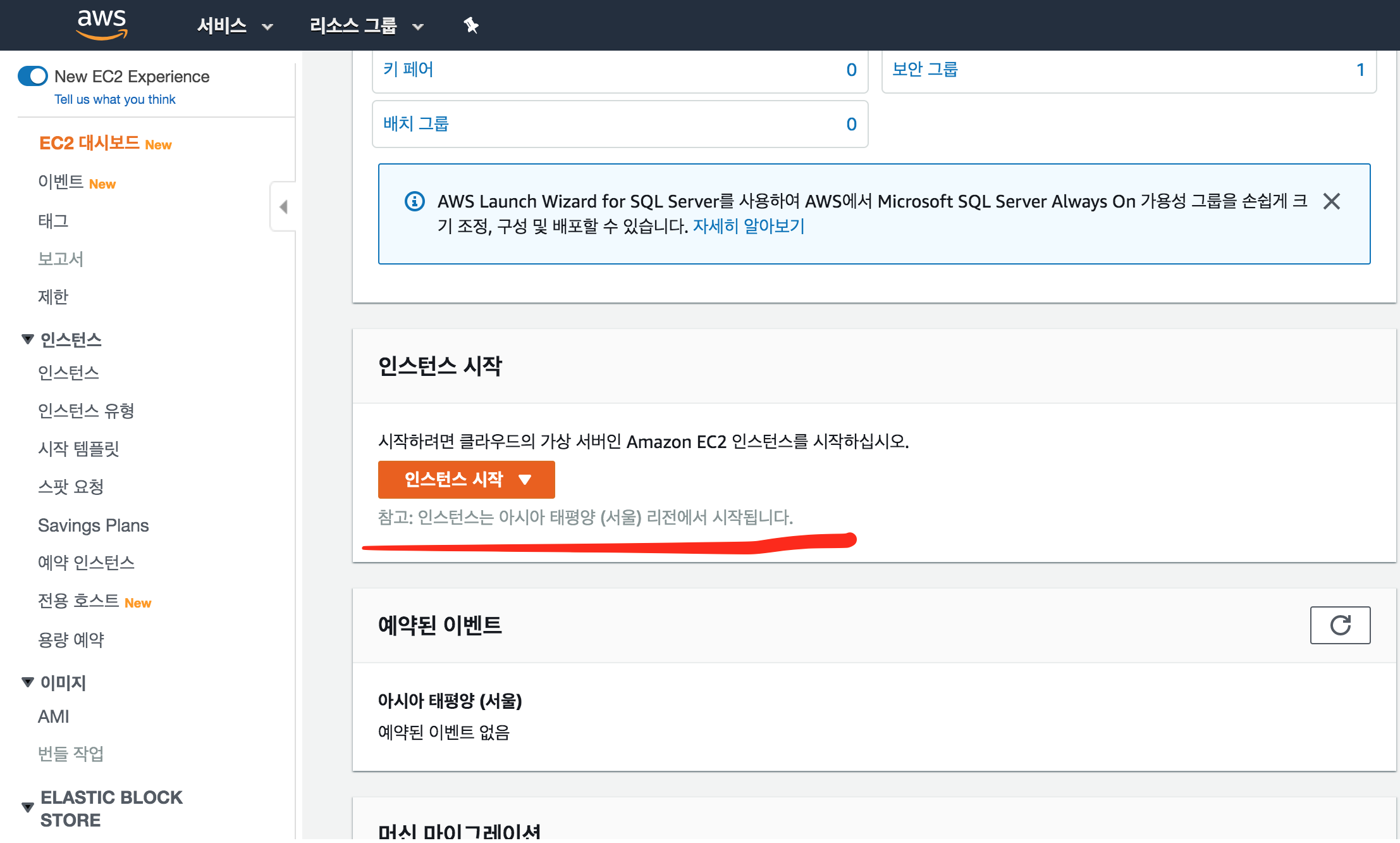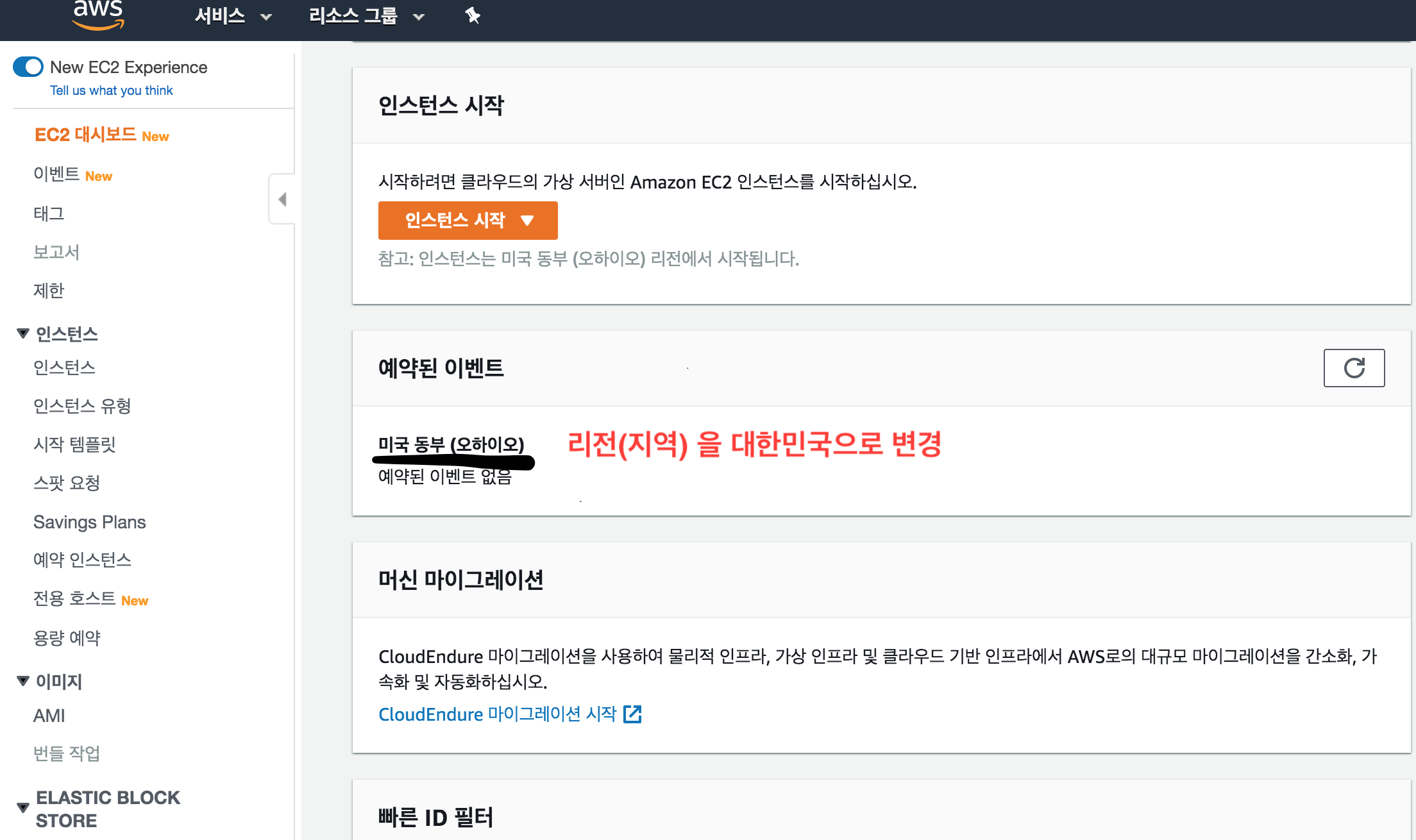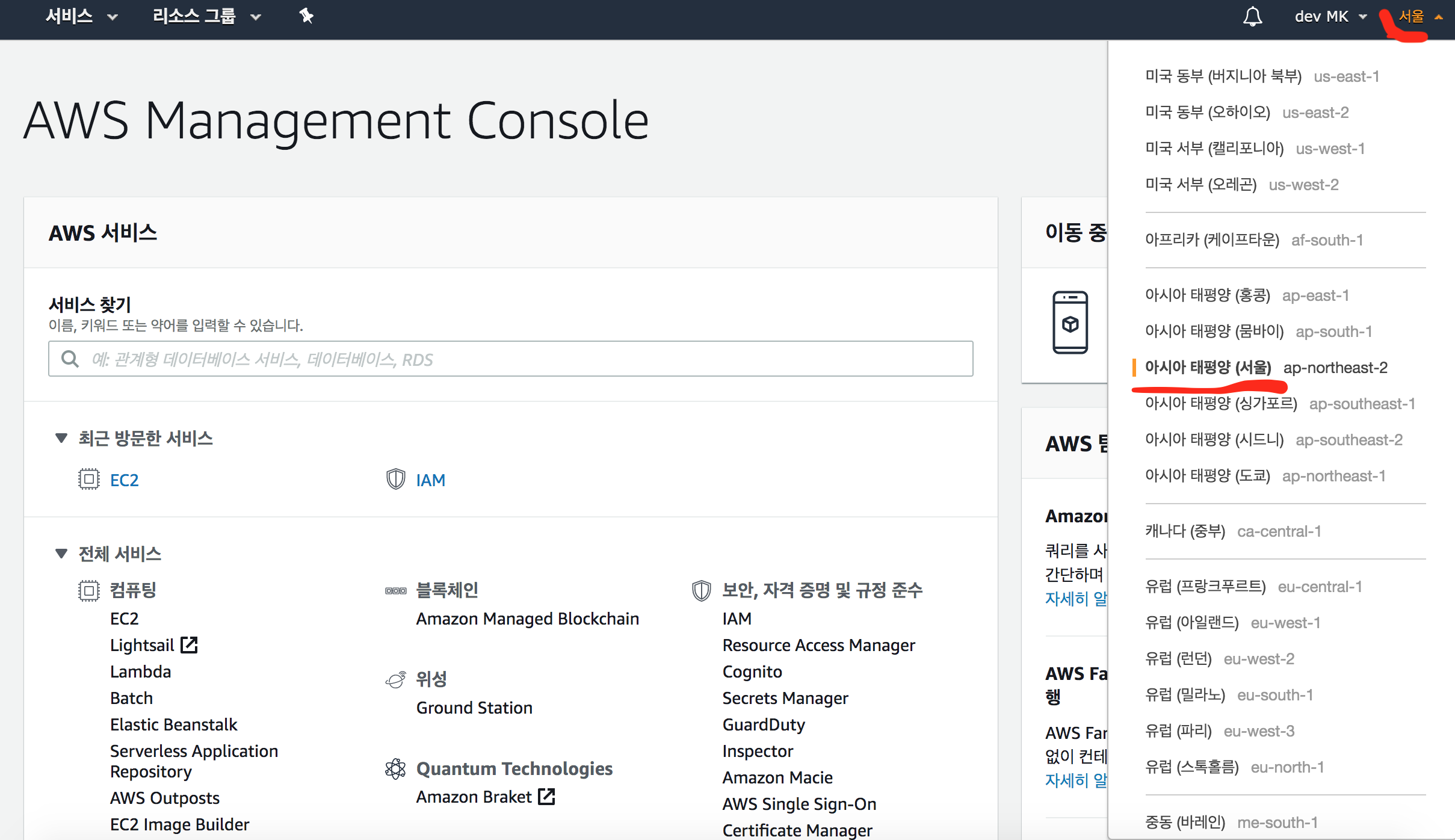 2. 인스턴스 생성전에 리전(지역)을 서울로 변경한다. 디폴트지역인 미국 동부로 해도 상관은 없다.