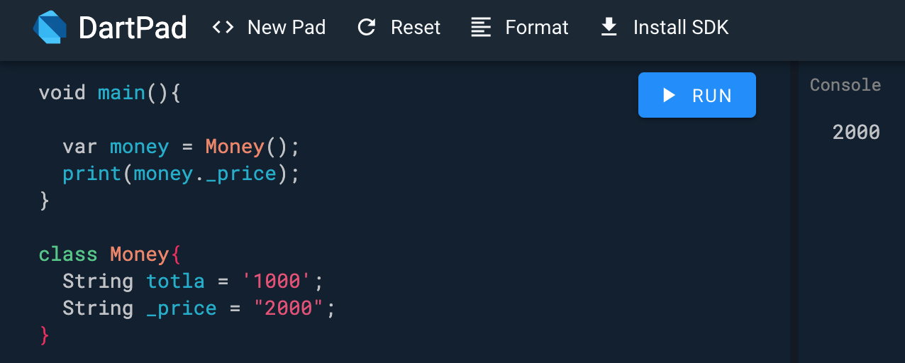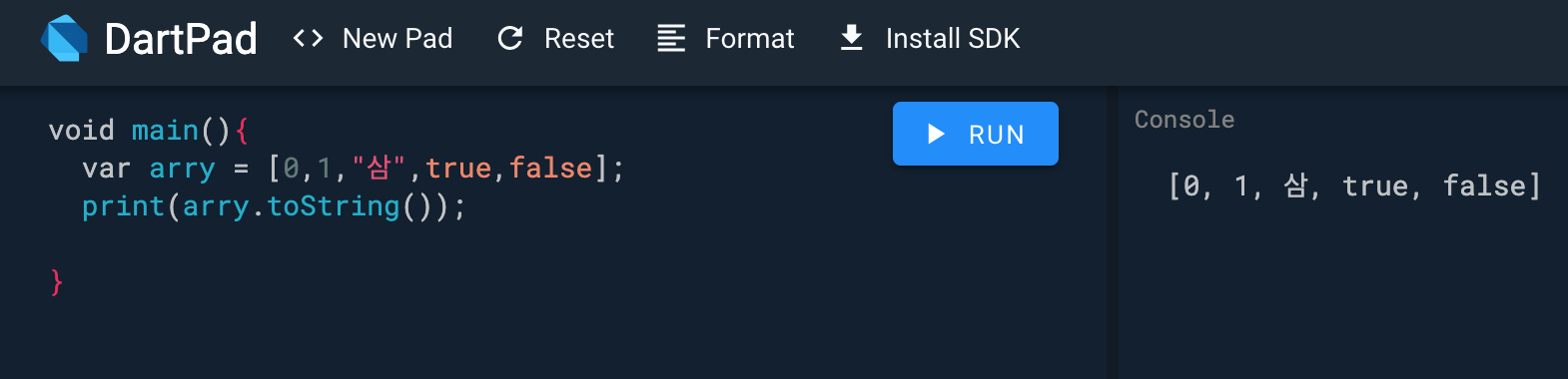 void main() { print('hello Dart'); //hello Dart }- main함수 블럭안에서 실행해야 출력이 된다.