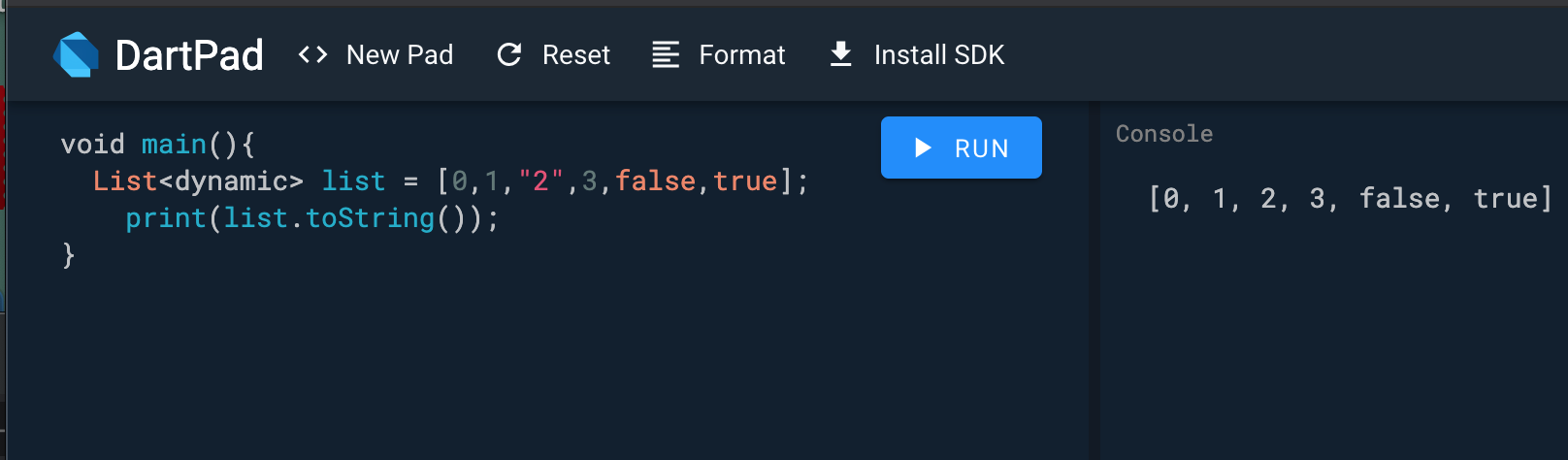 - Ex) List<dynamic> list = [0,1,”2”,3,false,true] 같은 형식이 가능 (전부 오브젝트로 취급되기 때문)