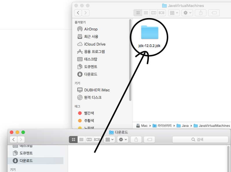 sudo mv jdk-12.0.1.jdk /Library/Java/JavaVirtualMachines/명령어로 이동이 안되면 그냥 마우스 드래그로 아래의 위치로 jdk폴더를 이동 시킨다.