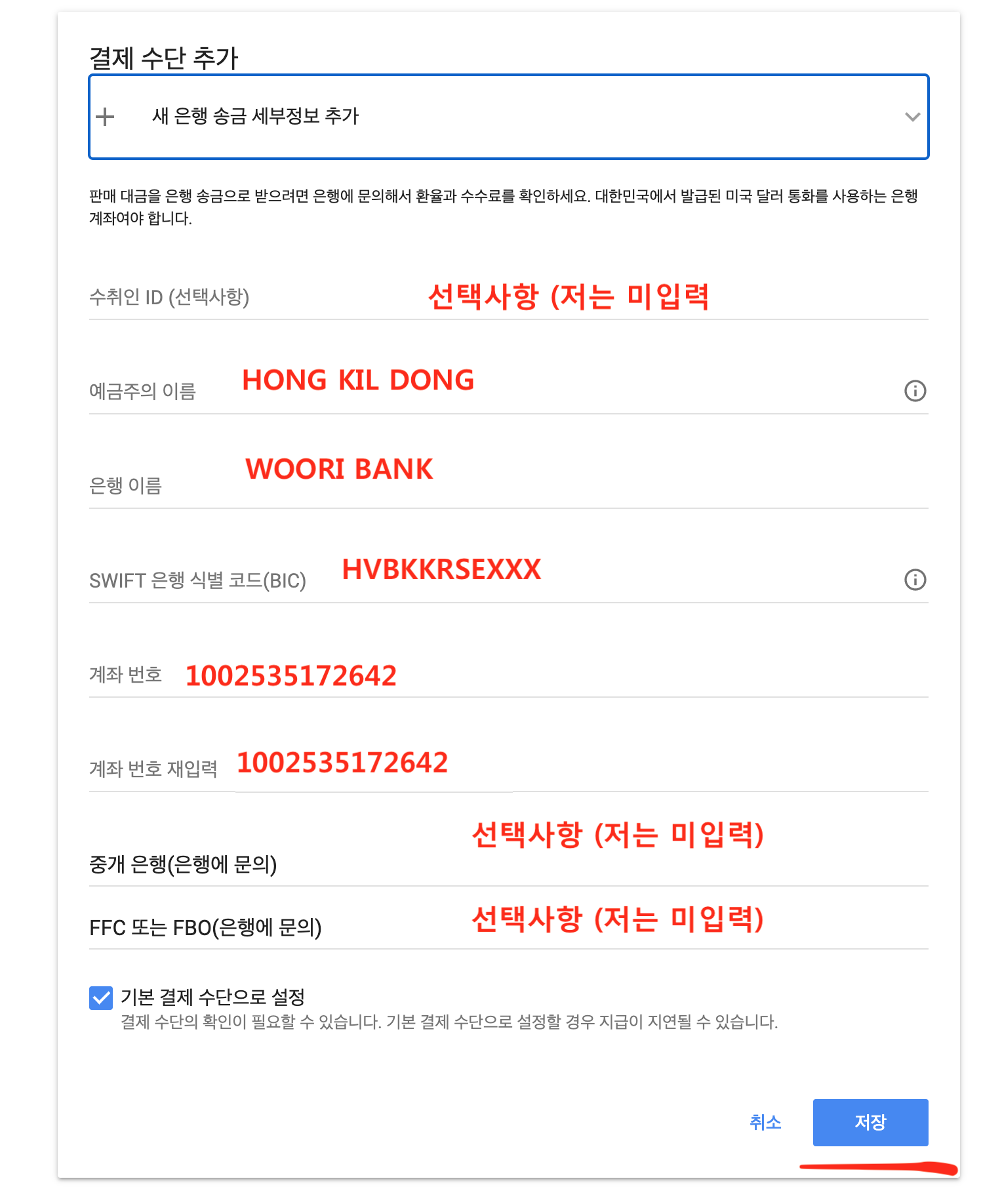 2. [새 은행 송금 세부정보 추가] 클릭하면 입력폼이 드랍다운 된다.