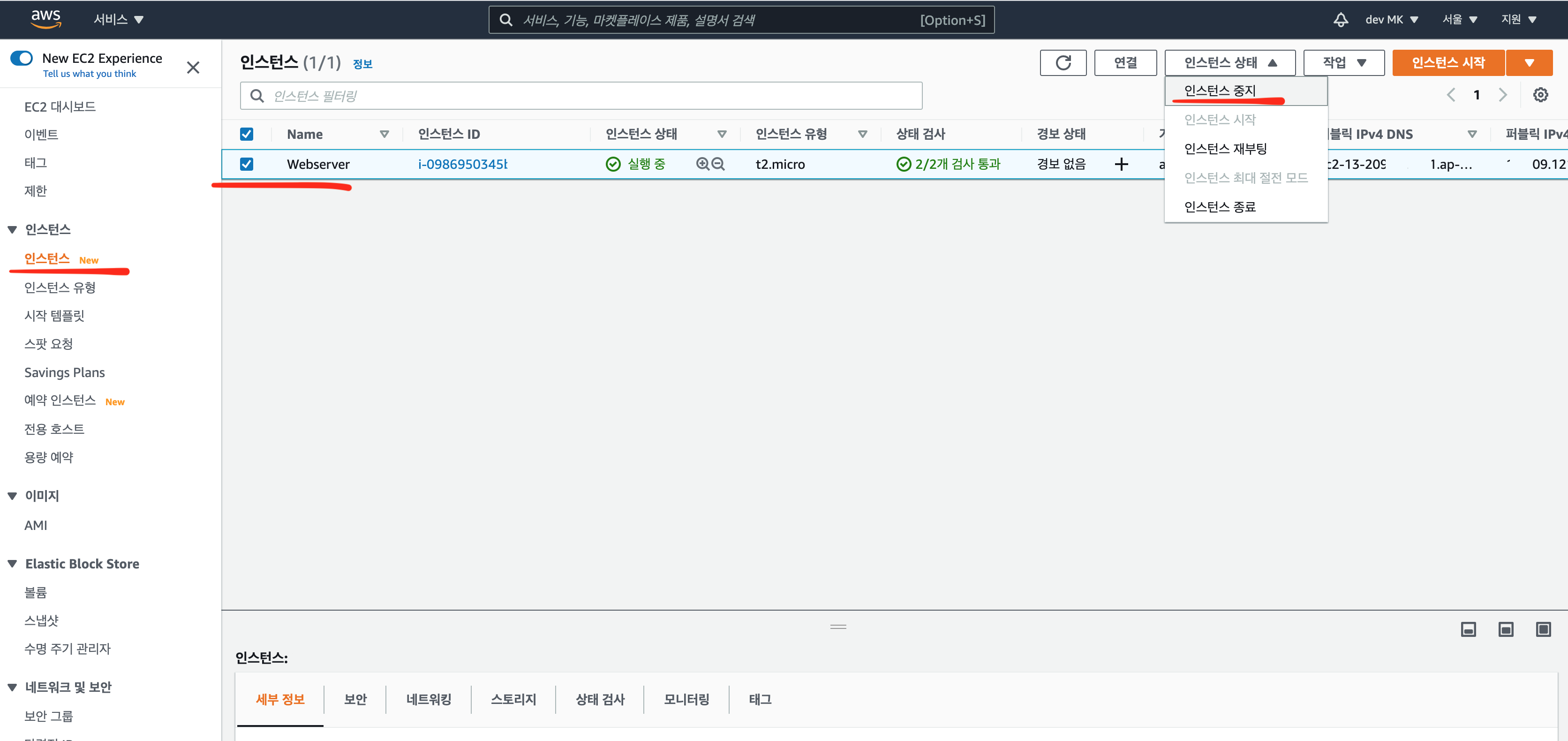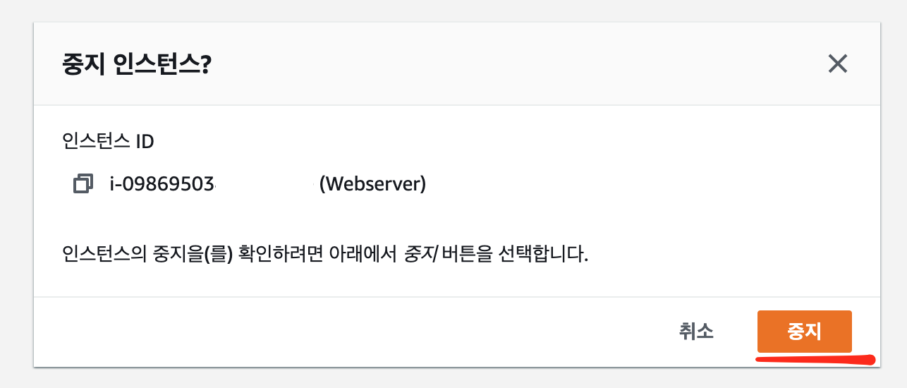죄측 메뉴 인스턴스 > 현재 운영중인 인스터스 체크 > [인스턴스 상태] > 중지