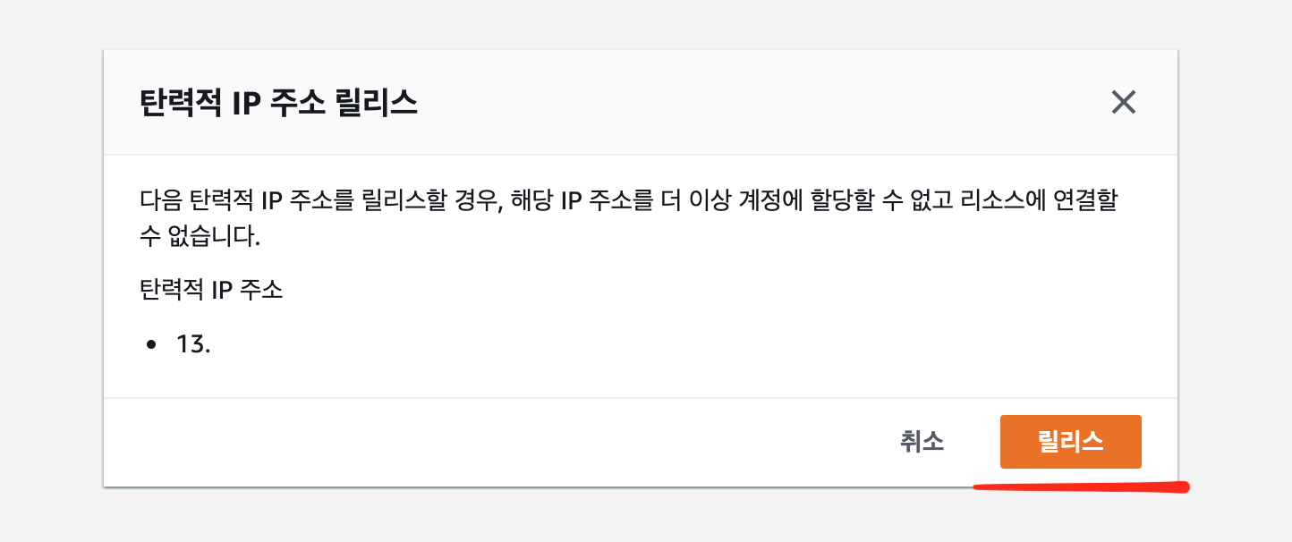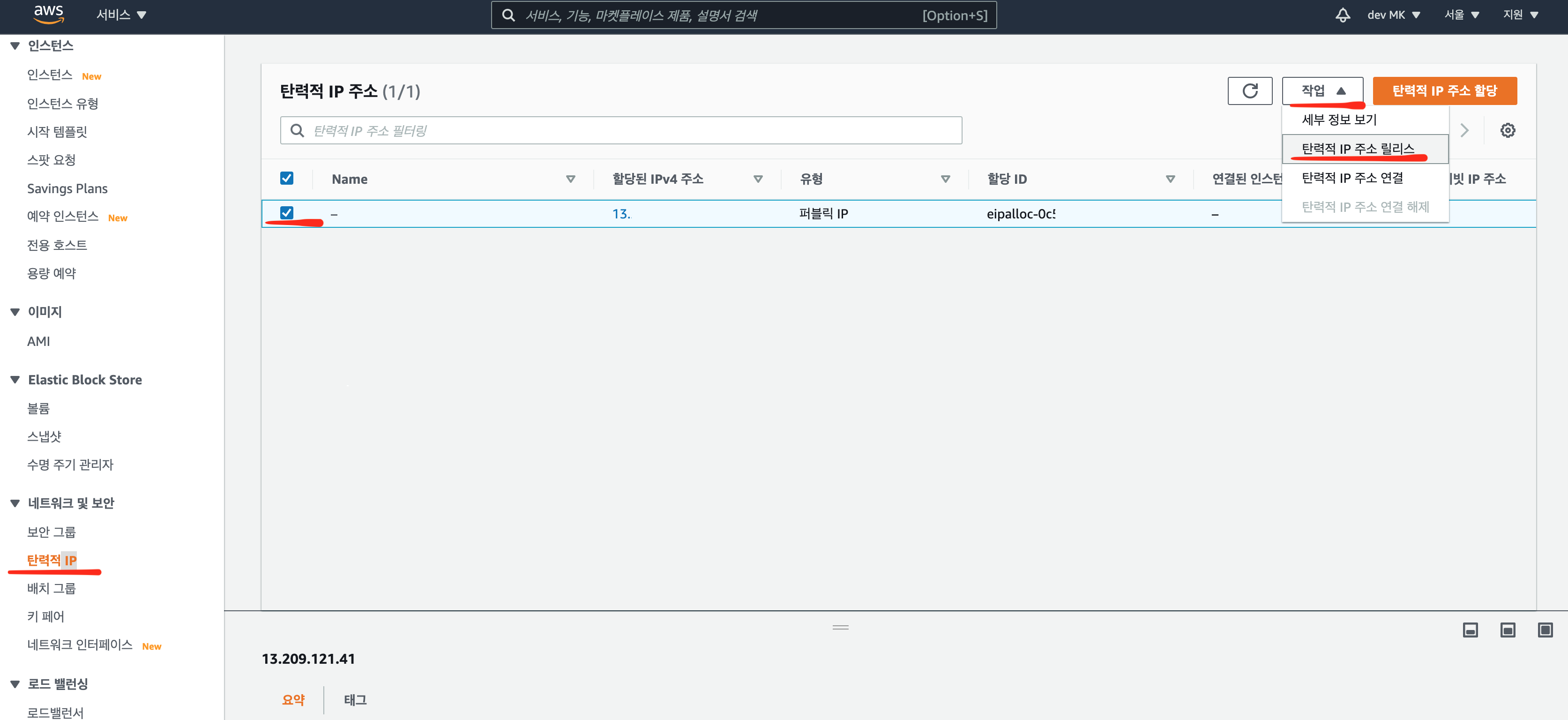 탄련적 IP > 현재 등록한 아이피 체크 > [작업] 탄련적 IP 주소 릴리스