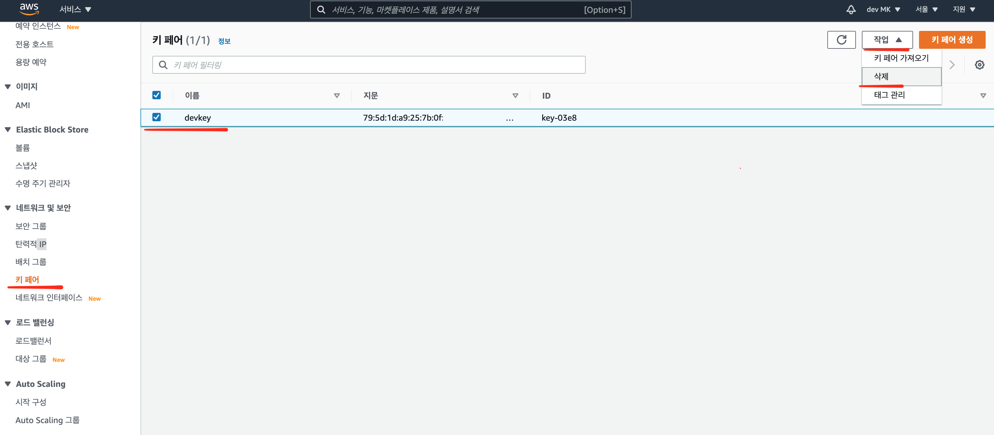 키 페어 > 등록한 키페어 체크 > [작업] > 삭제