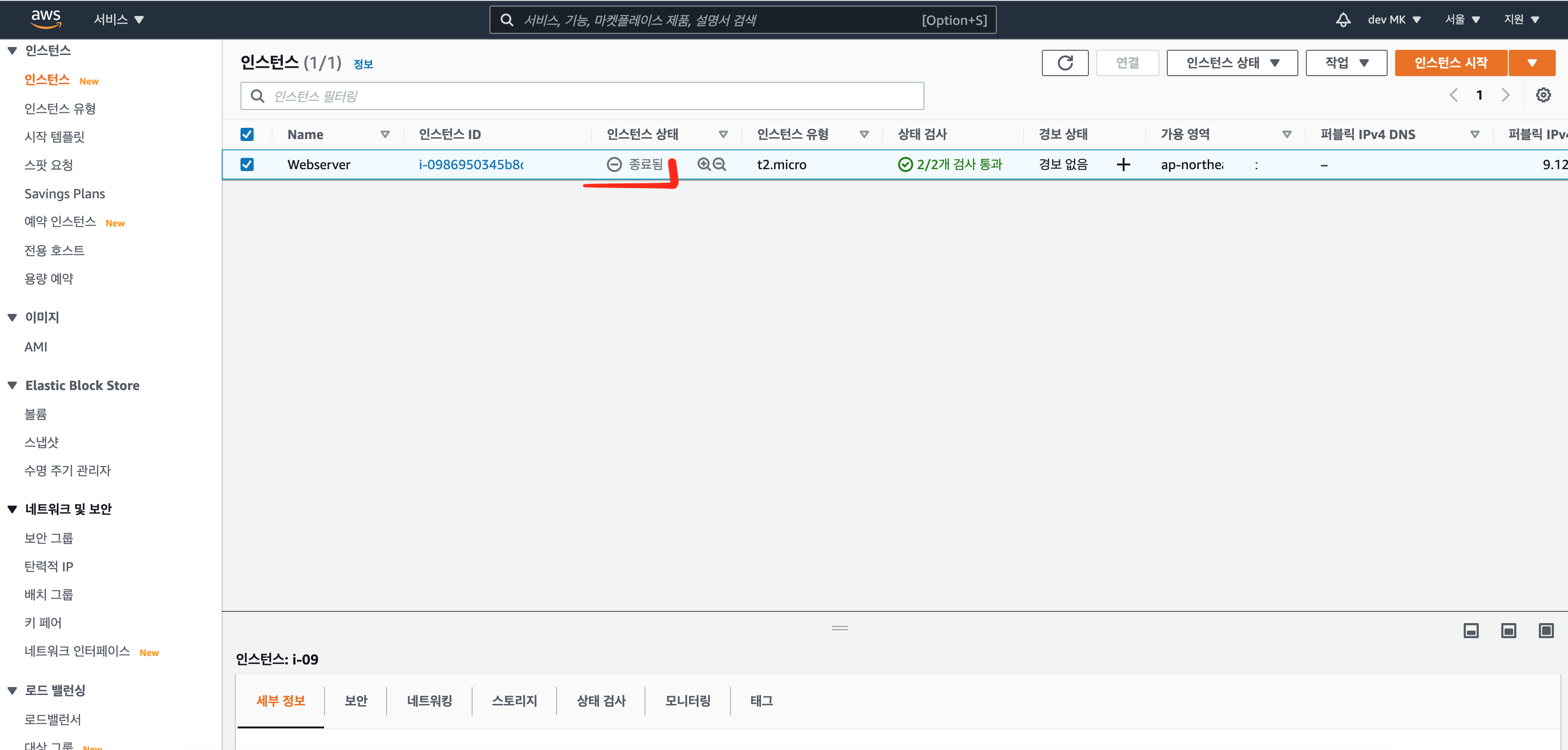 종료를 했는데 아직 인스턴스 목록에는 나온다. 갱신이 되려면 5~10분이 소요된다.