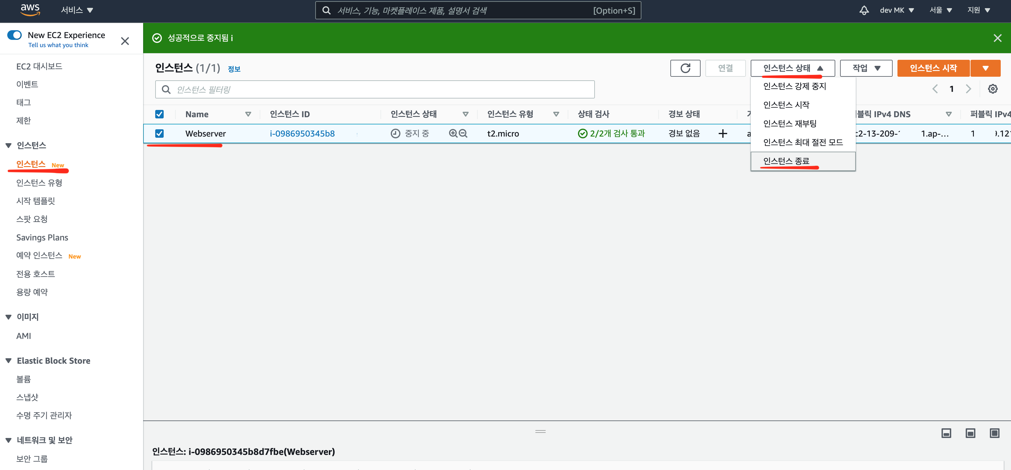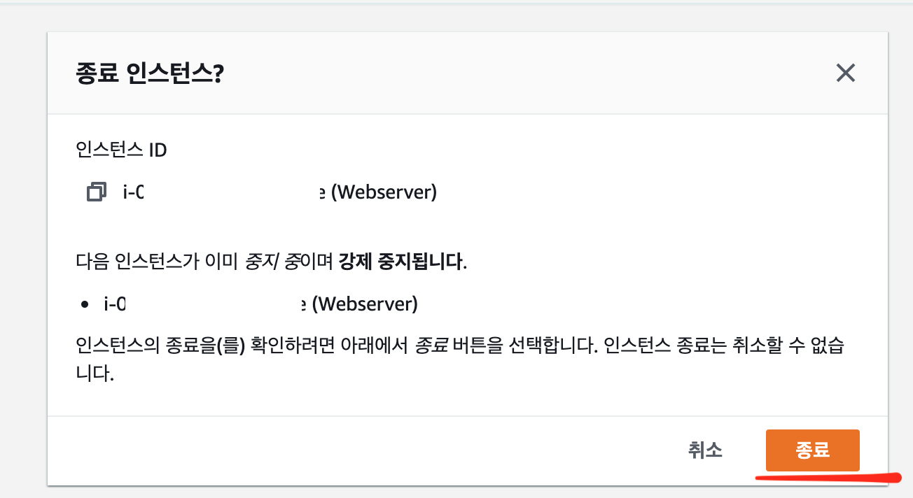 중지를 했으니깐 이제 종료를 누른다. 인스턴스 > [인스턴스 상태] > 인스턴스 종료