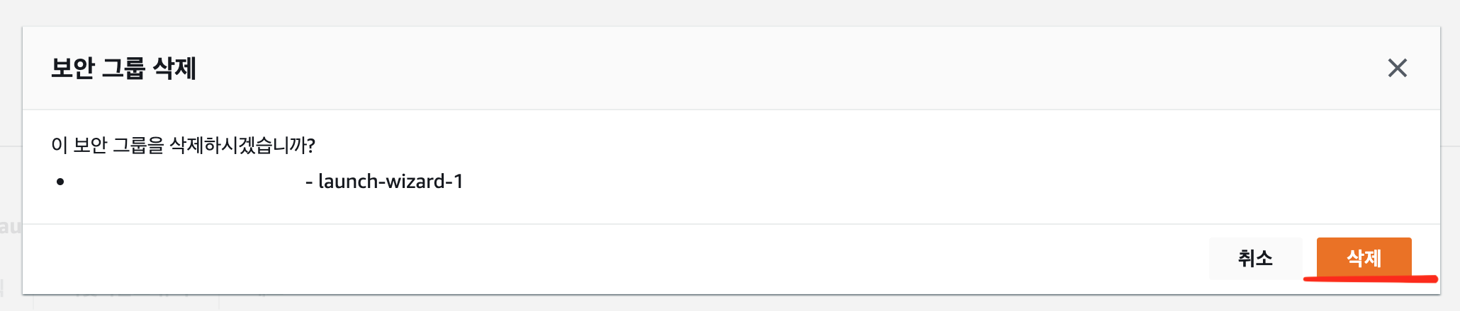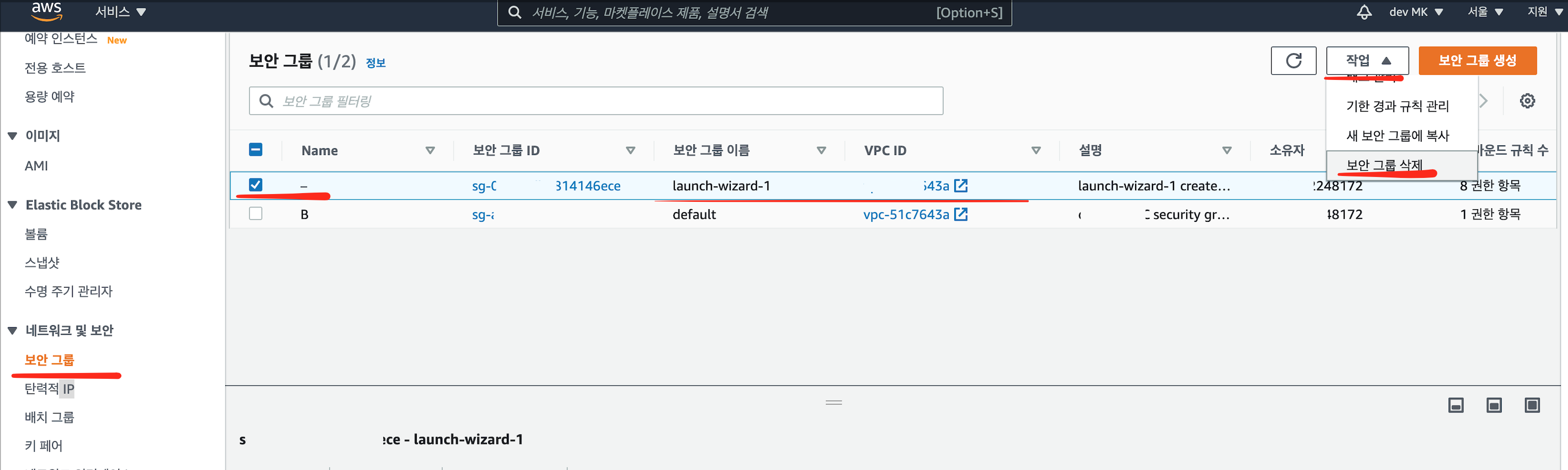 보안 그룹 > 현재 등록한 보안그룹 체크 > [작업] > 보안그룹 삭제