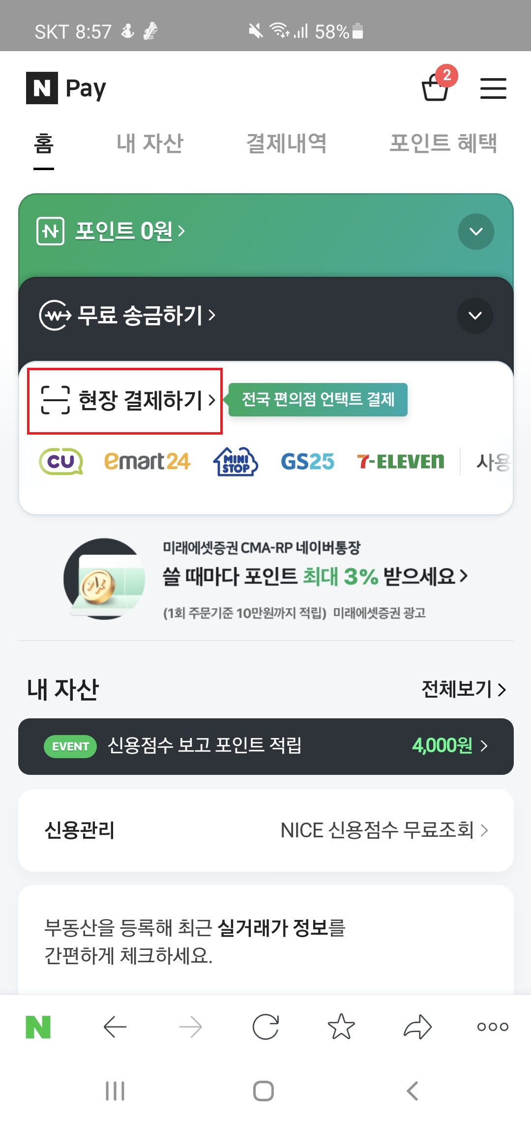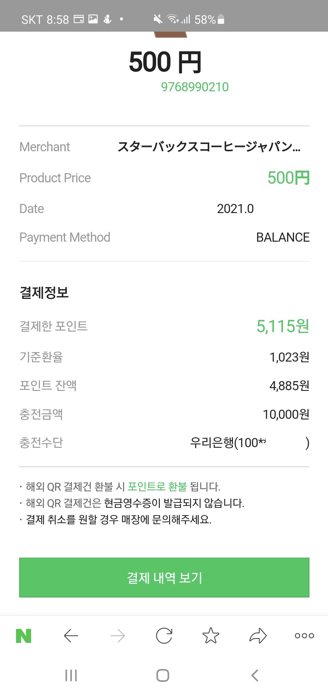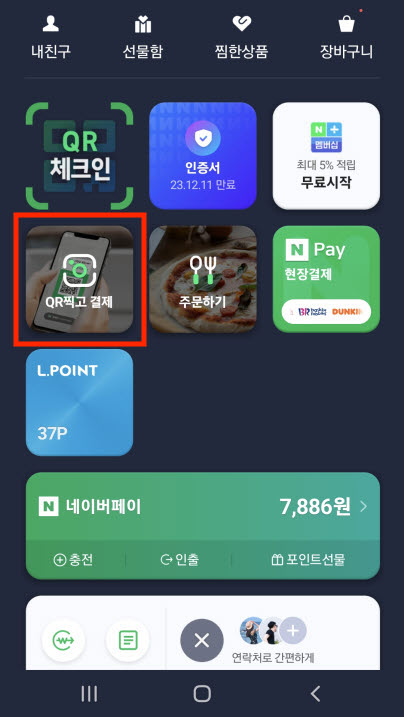 스마트폰으로 네이버 로그인하고 네이버페이 > 현장결제 누르고 저 QR을 스켄해야 한다.