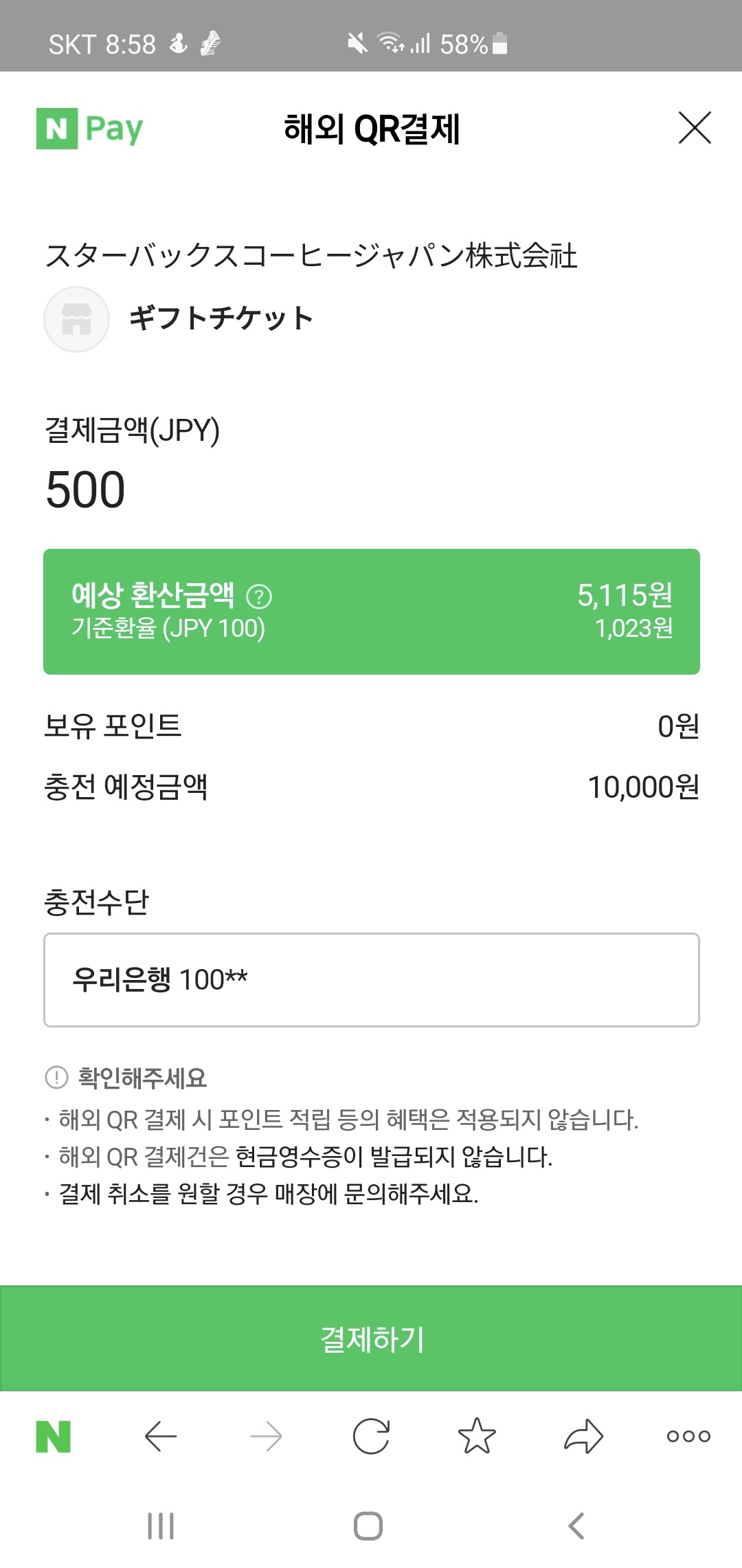 내가 결제를 해야하기 때문에 QR찍고 결제를 누른다.