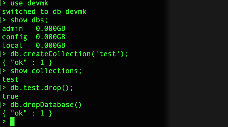 // 데이터베이스 생성 use 데이터베이스명 // 데이터베이스 확인 show dbs; // 컬렉션 생성 db.createCollection('컬렉션명'); // 컬렉션 확인 show collections; // 컬렉션 삭제 db.컬렉션명.drop(); // 데이터베이스 삭제 db.dropDatabase()