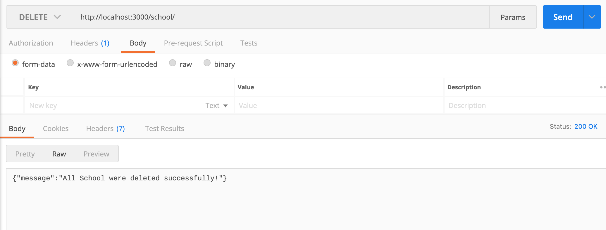 const express = require("express"); const bodyParser = require("body-parser"); const app = express(); app.use(bodyParser.json()); app.use(bodyParser.urlencoded({extended: true})); app.get("/", (req, res)=>{ res.json({message: "Hello Node!"}); }); require("./app/routes/school.routes.js")(app); // 포트넘버 설정 app.listen(3000, ()=>{ console.log("Server is running on port 3000."); })10. Controller 작성