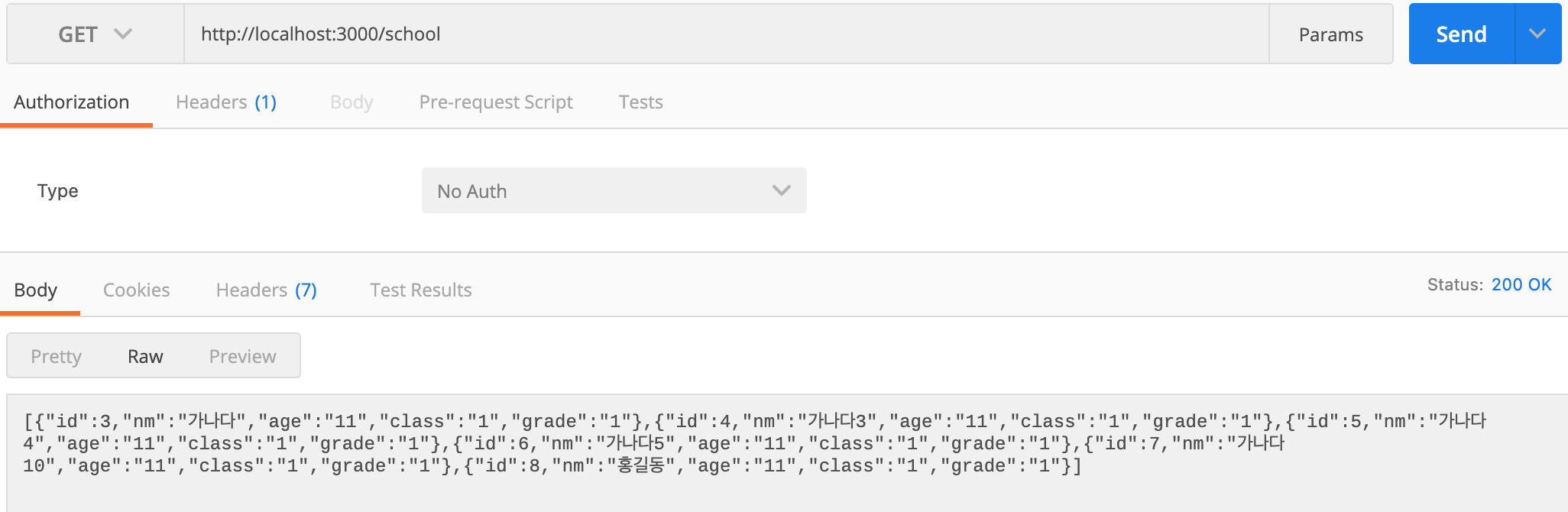 module.exports = app =>{ const school = require("../controllers/school.controller.js"); // 인서트 app.post("/school", school.insert); // 전체 조회 app.get("/school", school.findAll); // id로 조회 app.get("/school/:schoolId", school.findOne); // id로 수정 app.put("/school/:schoolId", school.update); // id로 삭제 app.delete("/school/:schoolId", school.delete); // 전체 삭제 app.delete("/school", school.deleteAll); };작성한 routes.js 파일을 server.js에 포함시킨다.