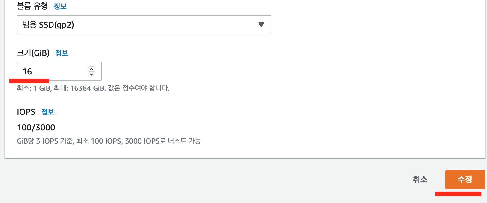 볼륨 > 볼륨 ID 클릭 > 수정 > 크기를 늘린다. (기가단위)