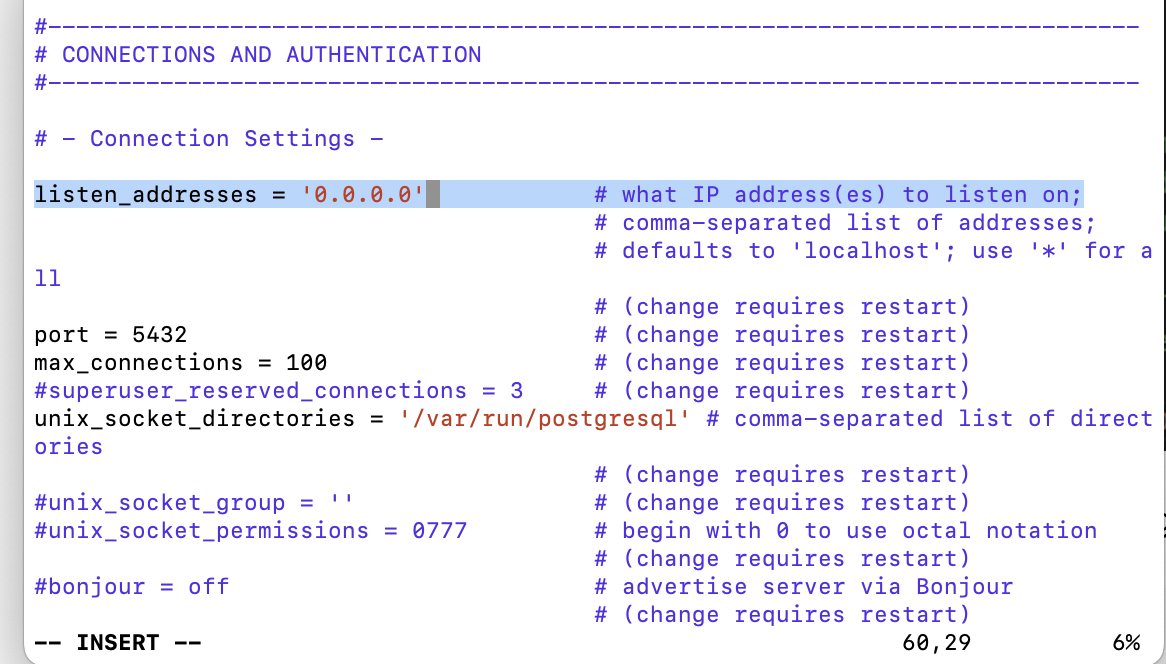 vi postgresql.conf60번째 줄에 위치한 listen_address 의 주석을 풀고 아이피 주소를 변경한다.