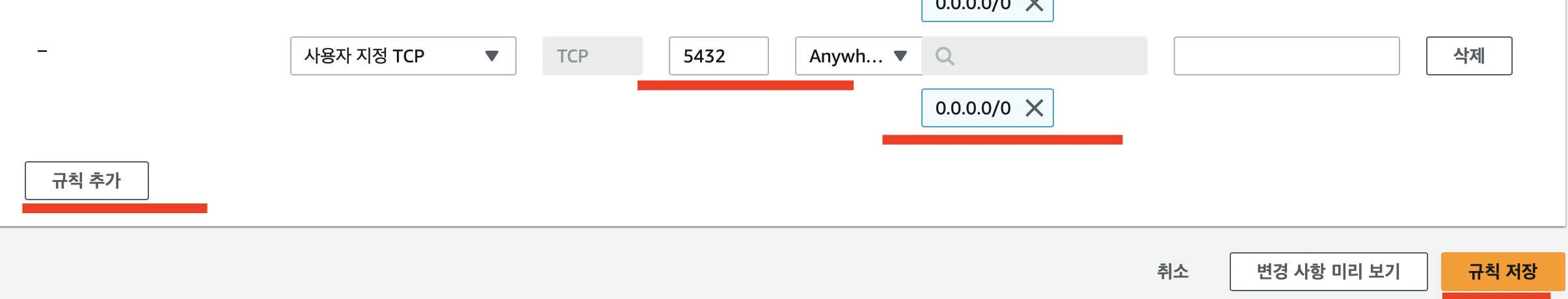 마지막 ec2대시보드에서 보안그룹을 추가한다.