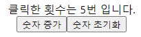 import React, { useState } from 'react'; const Counter = () => { //const [ 데이터, 데이터변경함수 ] = useState(초기값※생략가능); const [ cnt, setCnt ] = useState(0) const updateCnt = () => setCnt(cnt + 1); const clearCnt = () => setCnt(0); return ( <div> 클릭한 횟수는 {cnt}번 입니다. <div> <button onClick={updateCnt}>숫자 증가</button> <button onClick={clearCnt}>숫자 초기화</button> </div> </div> ); }; export default Counter;# 결과