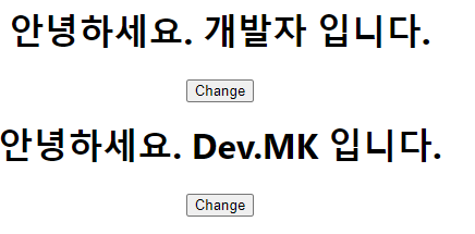 import React, { useState } from 'react'; const Main = () => { const [ myName, setMyName ] = useState("Dev.MK") function changeName() { setMyName(myName === "Dev.MK" ? "개발자" : "Dev.MK") } return ( <div> <h1>안녕하세요. {myName} 입니다.</h1> <button onClick={changeName}>Change</button> </div> ); }; export default Main;App.js