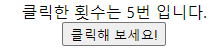 import React, { useState } from 'react'; //useState 훅을 사용정의 const Counter2 = () => { const [ state, setState ] = useState({cnt : 0}) //cnt라는 상태 변수를 선언하고 0으로 초기화함, //setState 함수는 상태를 업데이트하는 데 사용 const updateCnt = val => setState({ ...state, [val] : state[val] + 1}) //...state 구문은 현재 상태를 새 상태 개체로 확장하는 데 사용 const { cnt } = state return ( <div> 클릭한 횟수는 {cnt}번 입니다. <div> <button onClick={updateCnt.bind(null, 'cnt')}> 클릭해 보세요! </button> </div> </div> ); }; //bind() 함수를 사용하면 함수를 특정 값에 바인딩할 수 있다. export default Counter2;# 결과