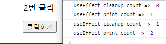 - 클릭시 cleanup 함수에서는 이전 count값, 그리고 렌더링 후 변경된 count값이 출력