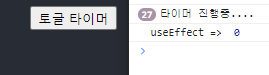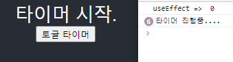 import { useState } from 'react' import Timer from './component/Timer'; import './App.css'; function App() { const [showTimer, setShowTimer] = useState(false); return ( <div className="App"> <header className="App-header"> {showTimer && <Timer/>} <button onClick={() => setShowTimer(!showTimer)}>토글 타이머</button> </header> </div> ); } export default App;# 결과 - 타이머 시작
