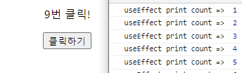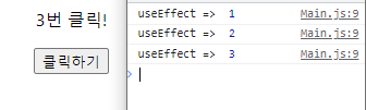 import React, { useState, useEffect } from "react"; const Main4 = () => { const [count, setCount] = useState(0); const countClick = () => setCount(count + 1); useEffect(() => { console.log("useEffect print count => ", count); return () => { console.log("useEffect cleanup count => ", count); } }, [count]); return ( <div> <p>{count}번 클릭!</p> <button onClick={countClick}>클릭하기</button> </div> ); }; export default Main4;#결과