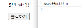 import React, { useState, useEffect } from "react"; const Main3 = () => { const [count, setCount] = useState(0); const countClick = () => setCount(count + 1); useEffect(() => { console.log("useEffect print count => ", count); }, [count]); return ( <div> <p>{count}번 클릭!</p> <button onClick={countClick}>클릭하기</button> </div> ); }; export default Main3;#결과