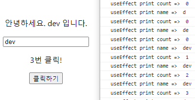 import React, { useState, useEffect } from "react"; const Main3 = () => { const [count, setCount] = useState(0); const [name, setName] = useState("Dev.MK"); const countClick = () => setCount(count + 1); const handleChangeName = (e) => setName(e.target.value); useEffect(() => { console.log("useEffect print count => ", count); console.log("useEffect print name => ", name); }, [name,count]); return ( <div> <p>안녕하세요. {name} 입니다.</p> <input onChange={handleChangeName} /> <p>{count}번 클릭!</p> <button onClick={countClick}>클릭하기</button> </div> ); }; export default Main3;#결과