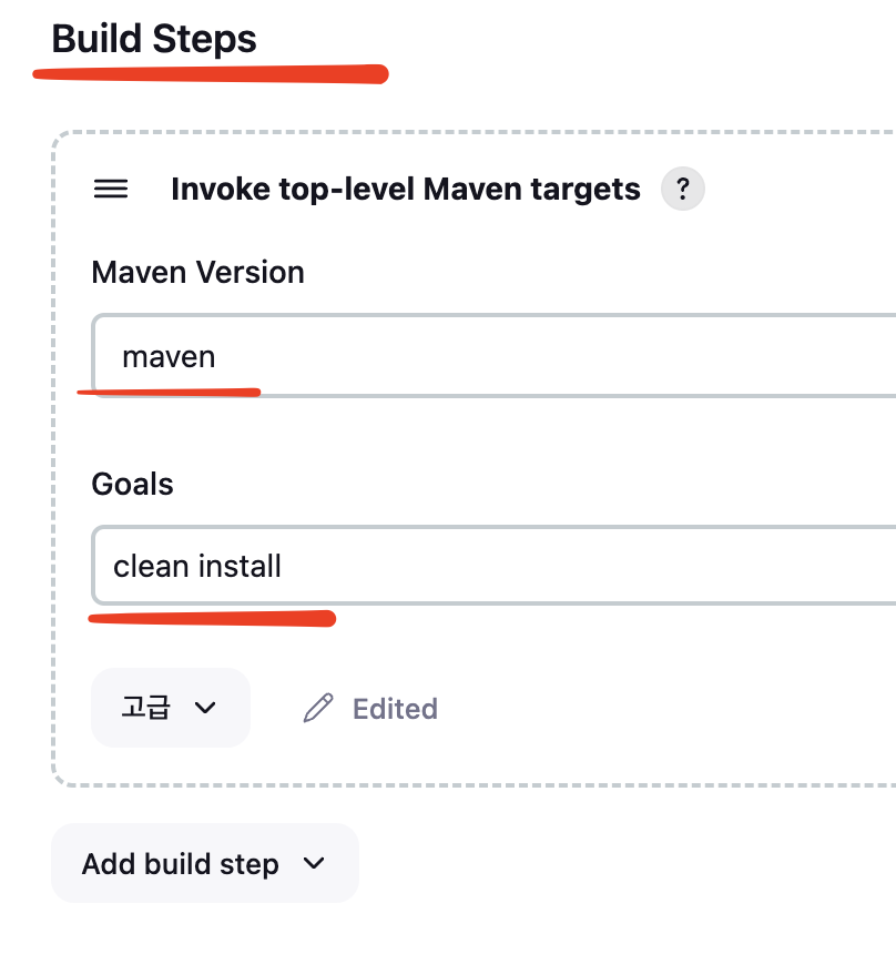 -Build steps > Invoke top-level Maven targets 선택 후 작성한다.