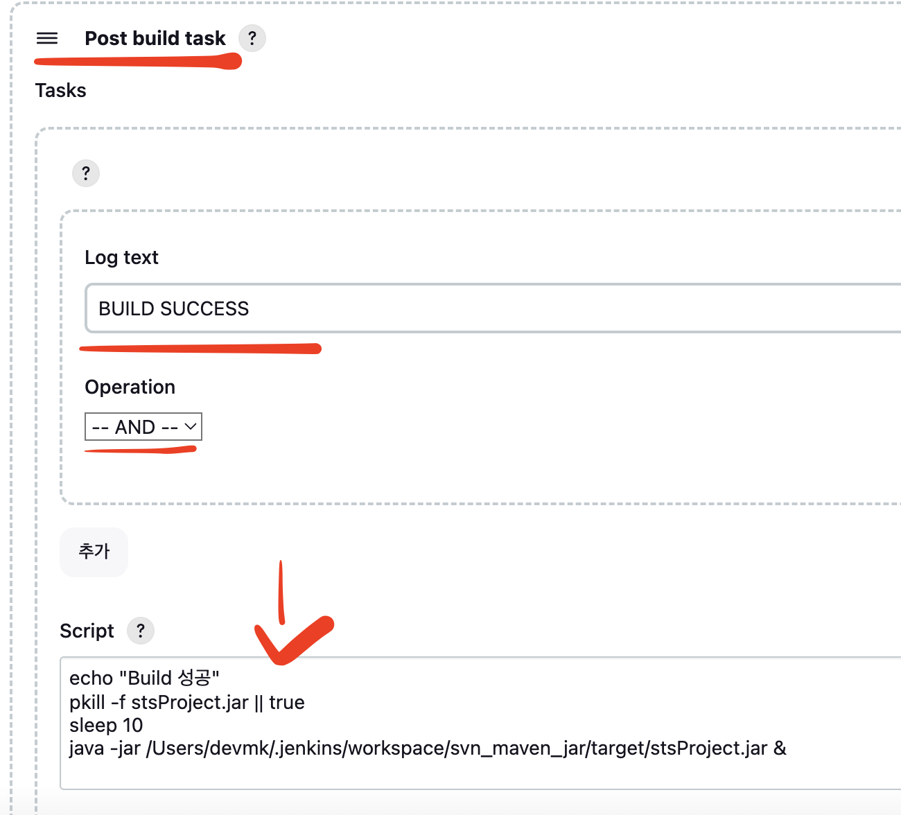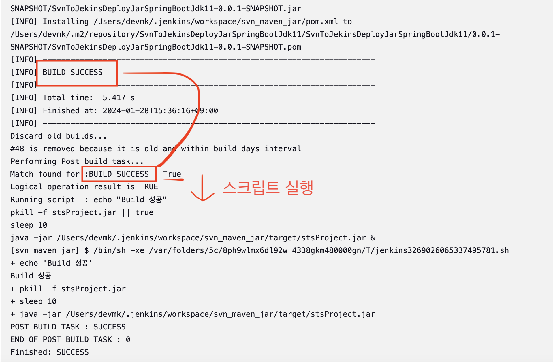 echo "Build 성공" pkill -f stsProject.jar || true sleep 10 java -jar /Users/devmk/.jenkins/workspace/svn_maven_jar/target/stsProject.jar &위의 스크립트내용은 현재 실행되있는 jar 파일을 한번 종료시키고 10초 후 재기동하는 명령어다.