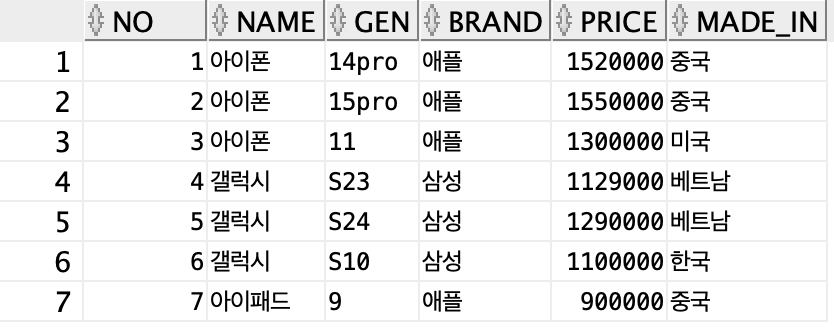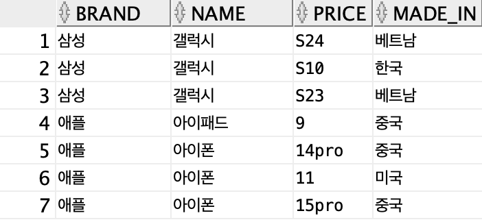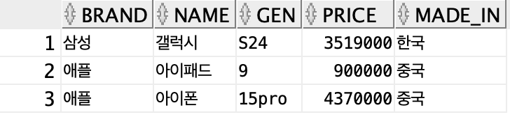 SELECT DISTINCT BRAND, NAME, GEN PRICE, MADE_IN FROM TB_ITEM;결과