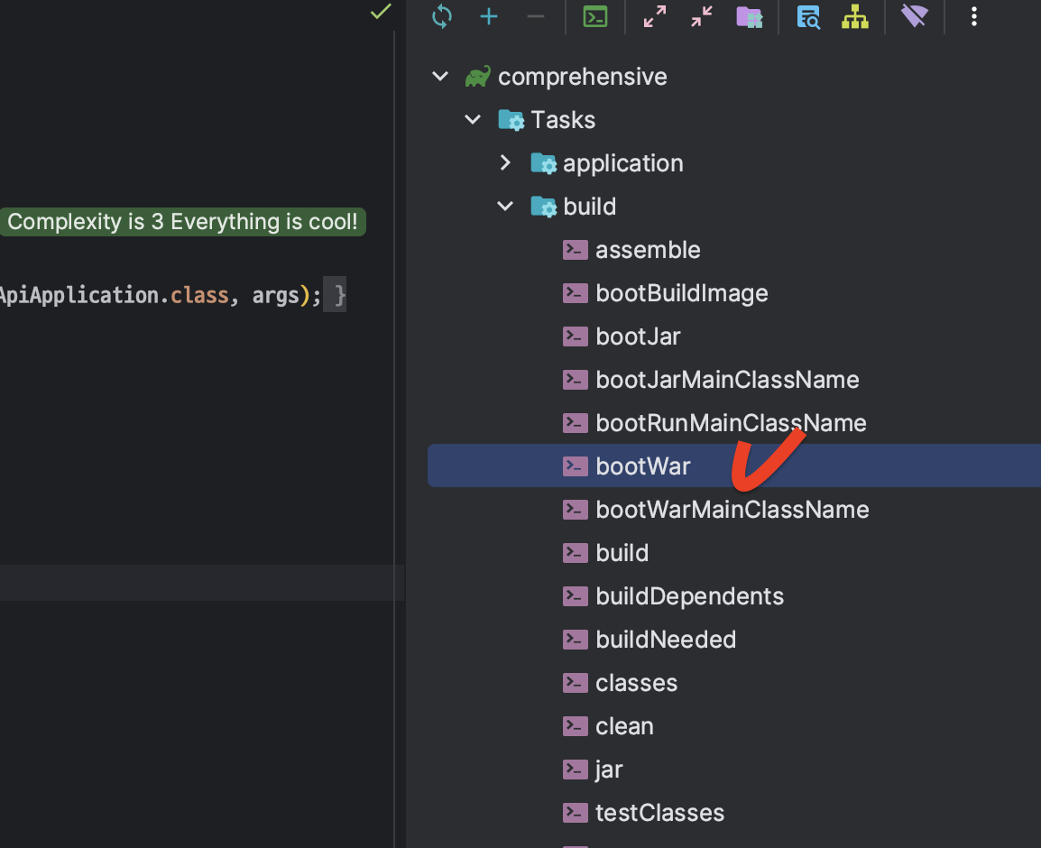 gradle영역 에서 새로고침을 해주고 Tasks > build > bootWar를 터블클릭해준다