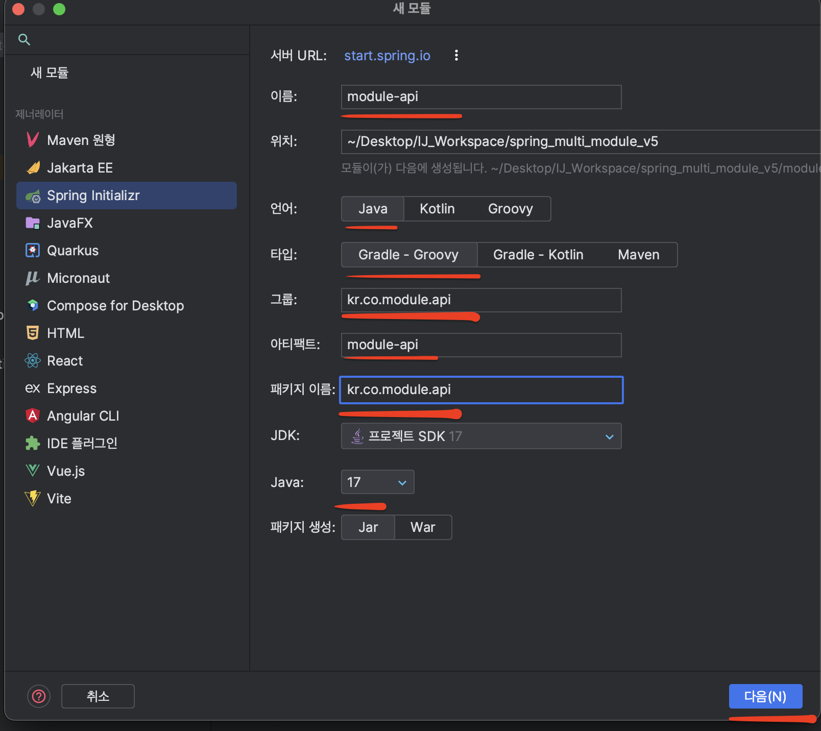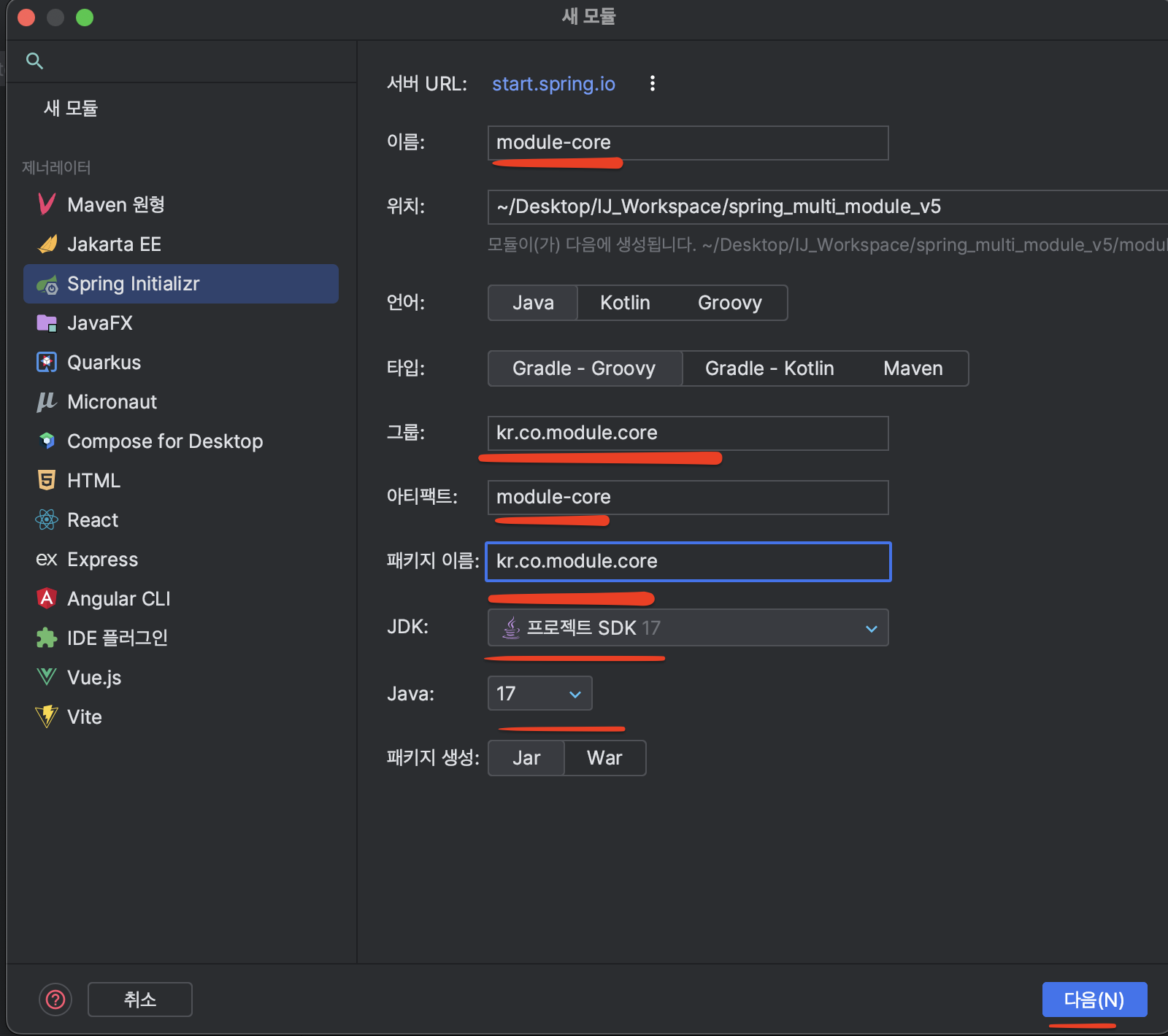 패키지이름을 전부 동일하게 하면 안된다. 패키지 끝에 현재 모듈명을 꼭 넣어주자