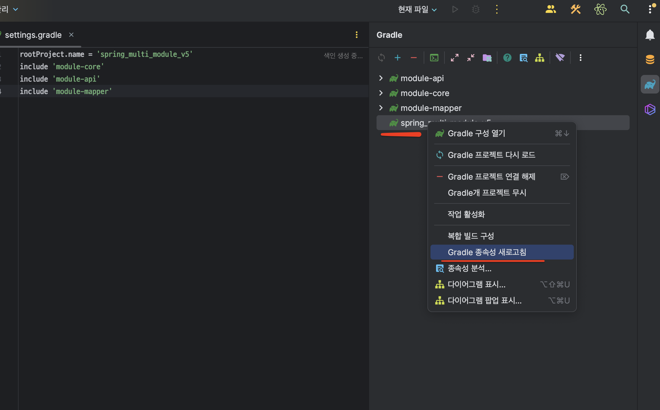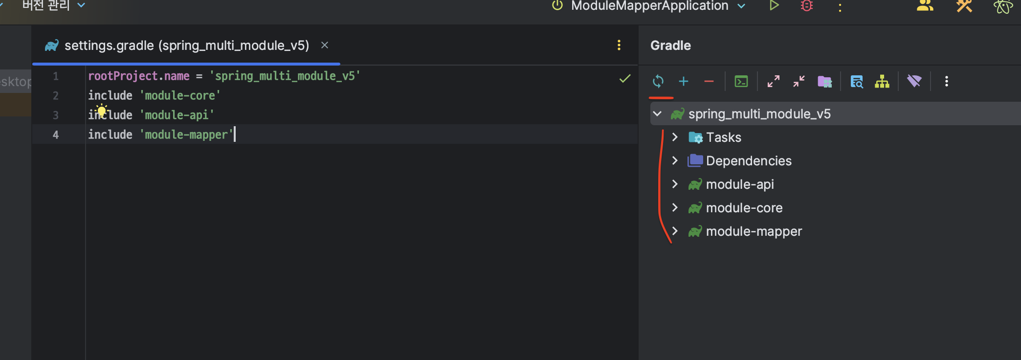 12. 루트 그래들을 리프레시 해주면 하위 모듈 그래들이 루트 안으로 들어간다.