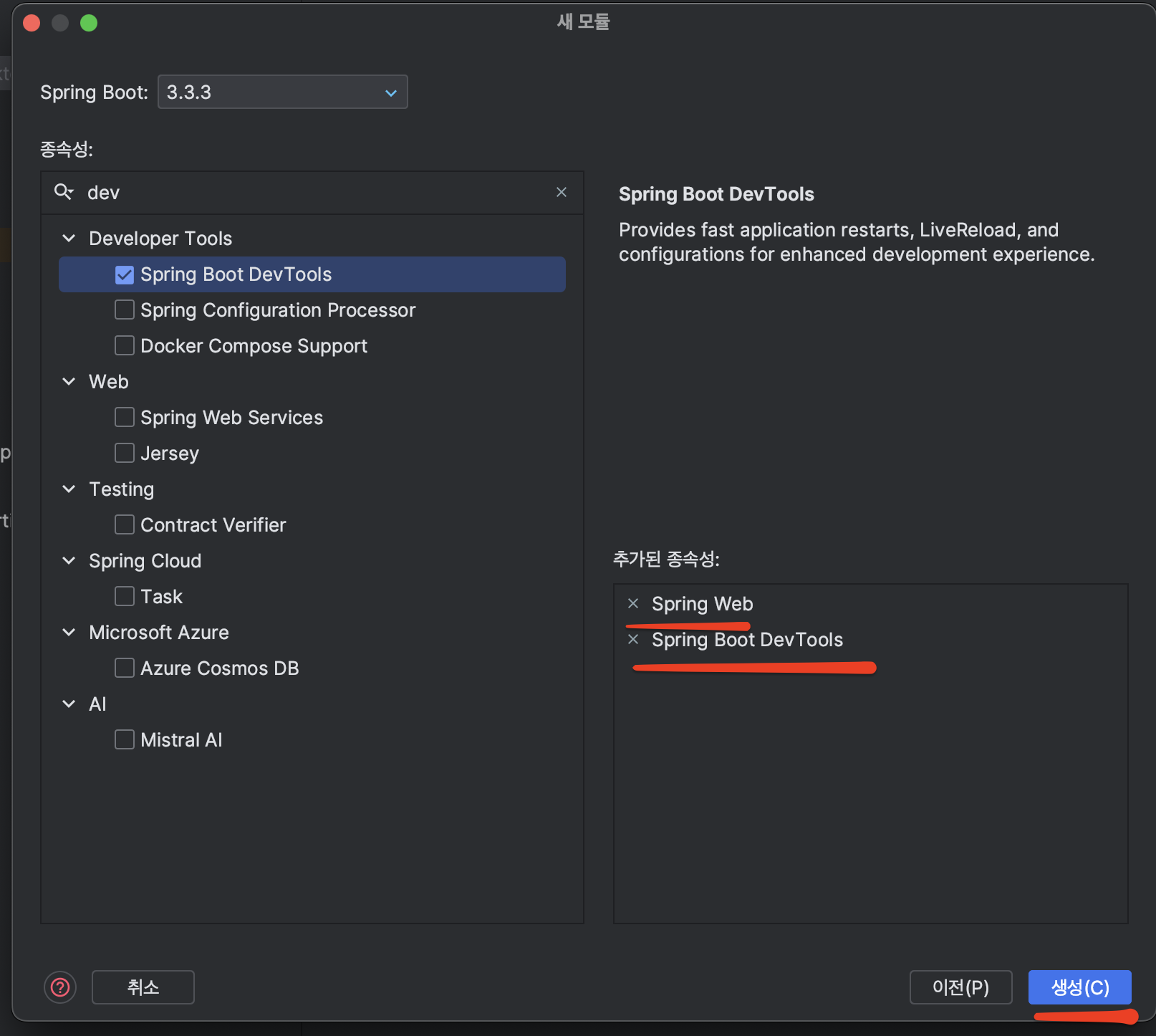 컨트롤러를 사용하기 때문에 Web 의존을 추가한다.