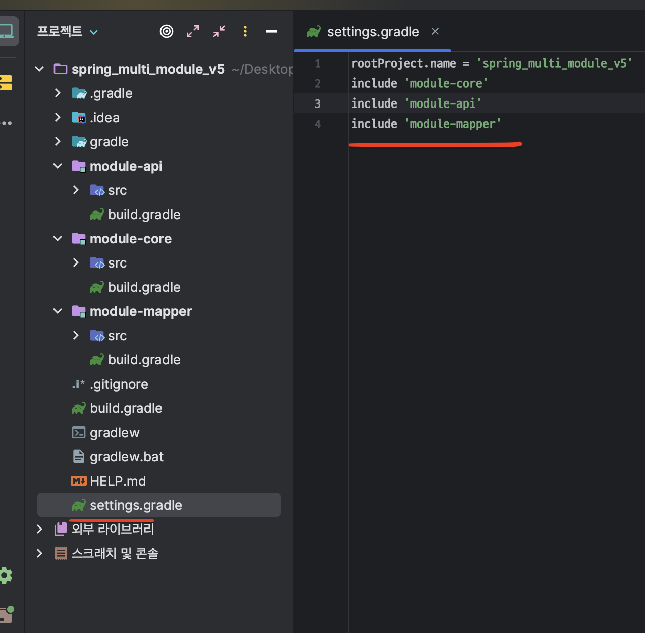 9. root 프로젝트의 settings.gradle을 열어 하위 모듈을을 전부 임포트 해주자.