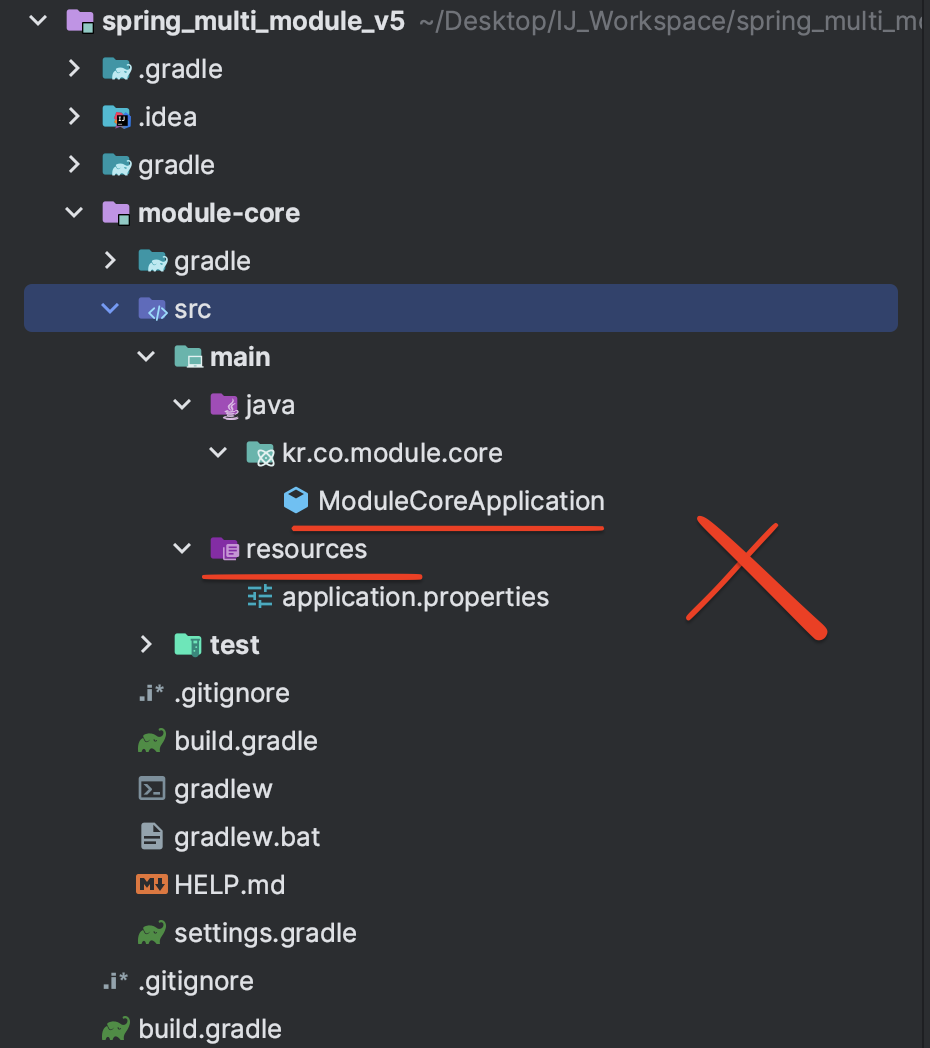 공통 모듈은 jar로 임포트해서 사용하는 모듈이기때문에 스프링부트 어플리케이션 java 및 리소스폴더가 필요없다.